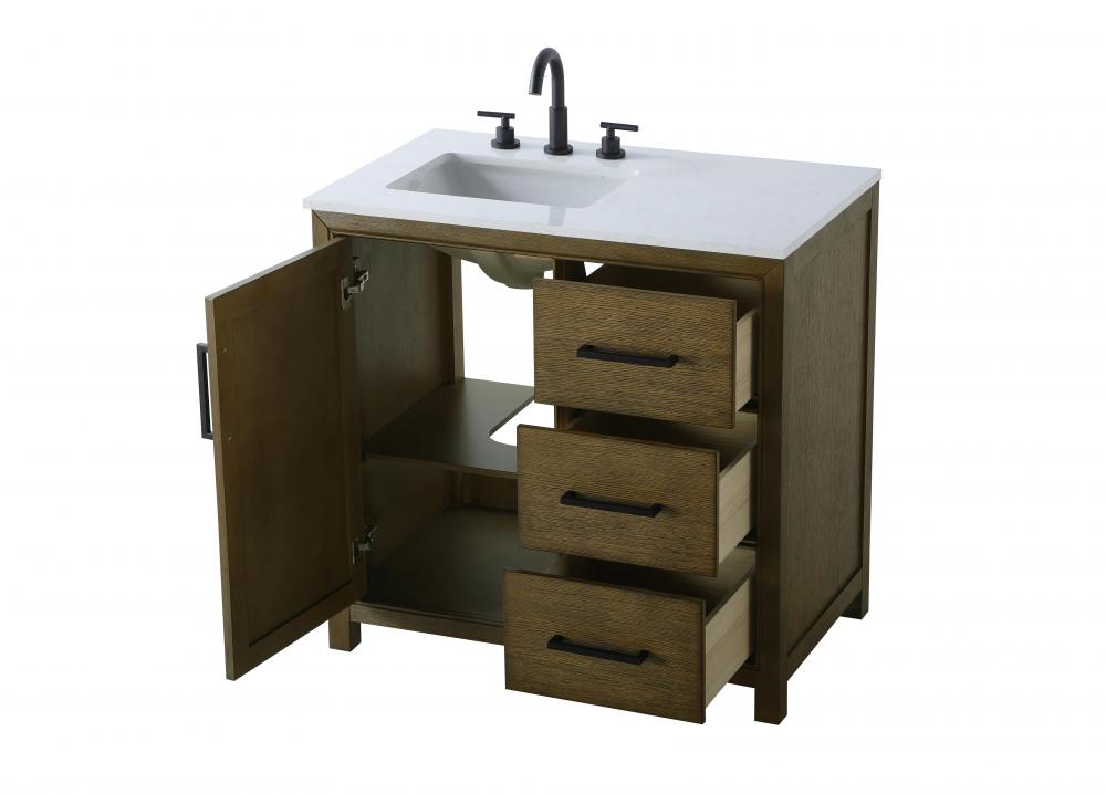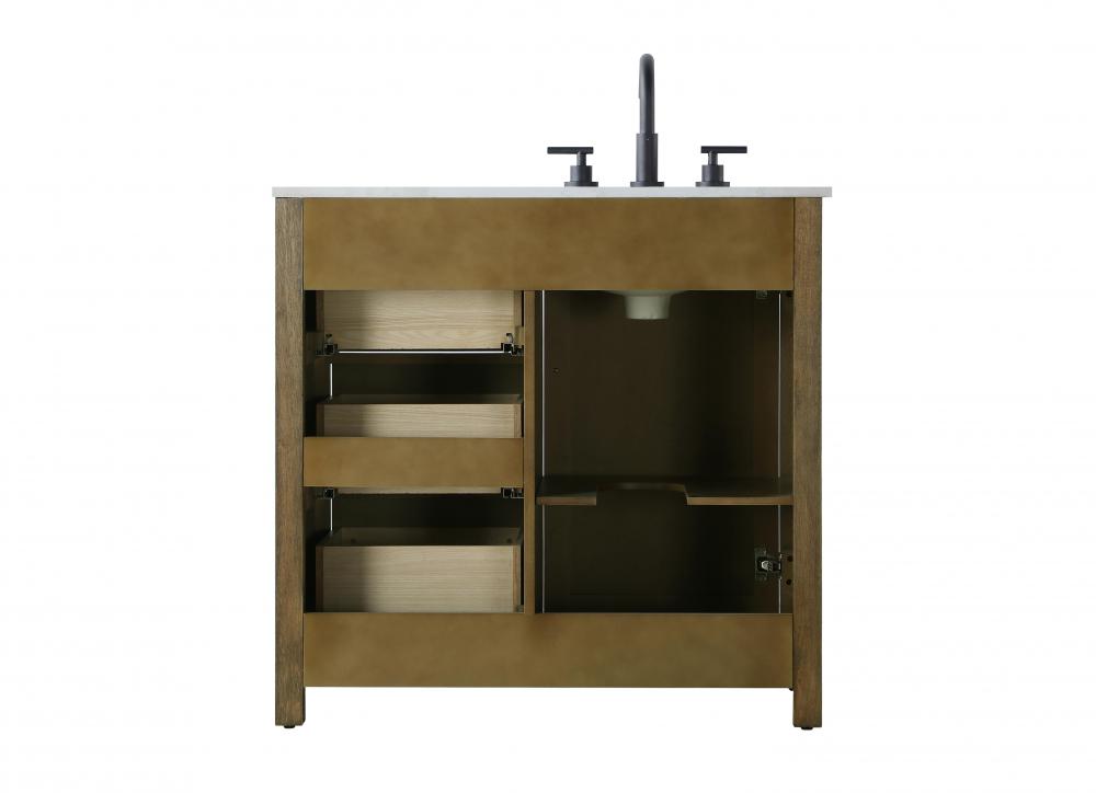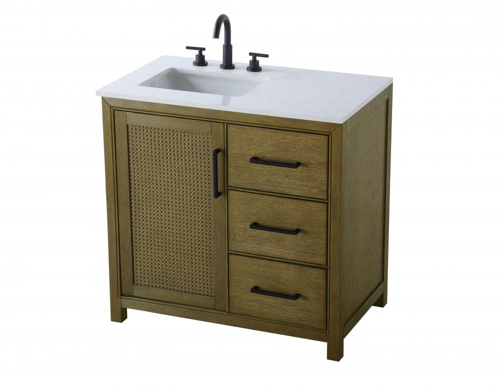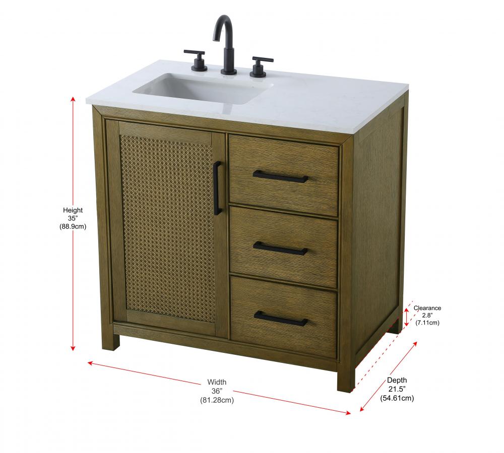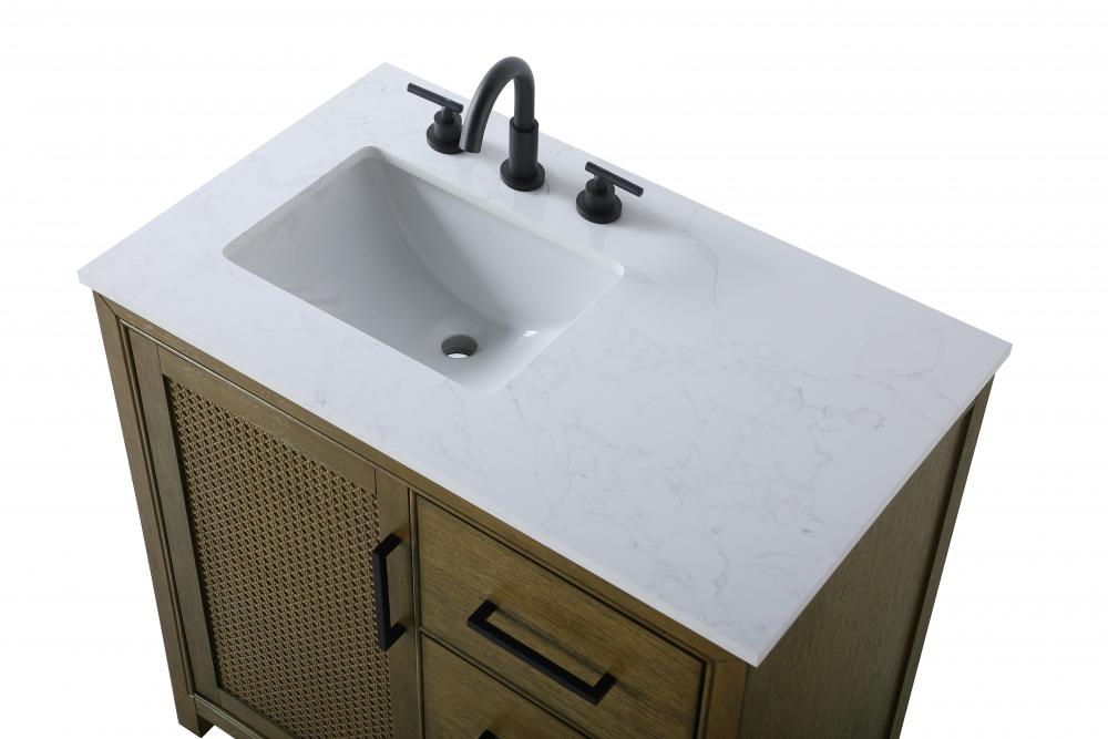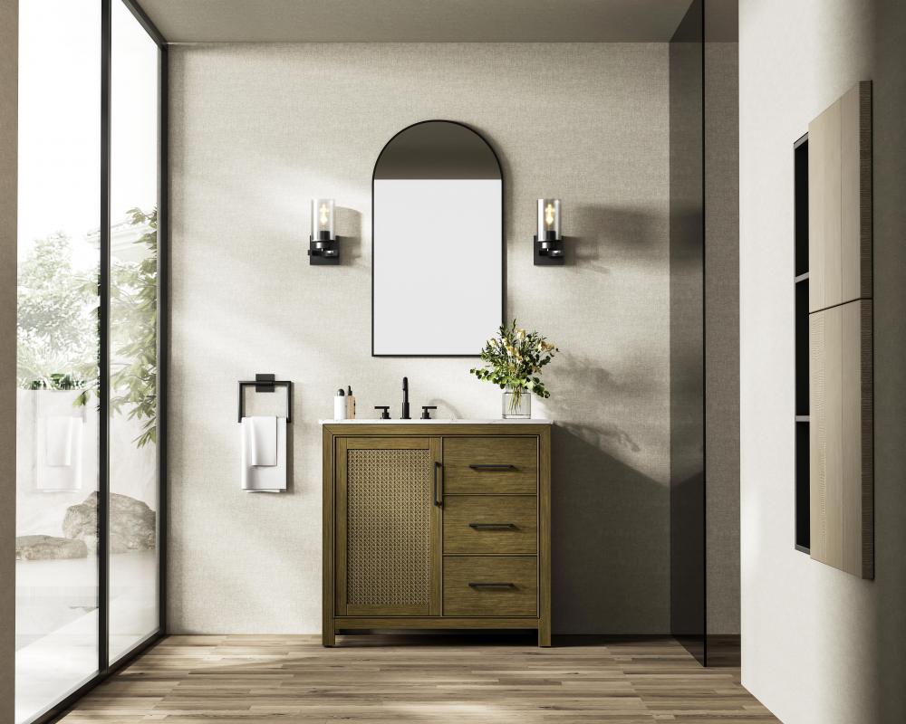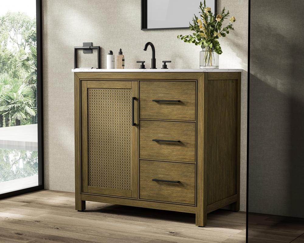 Perfect for those with an eye for detail and quality, this transitional vanity blends modern design with timeless elegance. Available in five stunning finishes, from Crisp White to Linen Oak, the wood grain visuals of the oak options bring warmth and character to any bathroom. The caning design on the Shaker-style door panels adds texture and a touch of refinement, while the soft-closing doors and drawers ensure smooth, quiet functionality. Topped with a white engineered marble countertop, the vanity offers both luxury and practicality, complete with pre-drilled faucet holes for customization. A concealed overflow and U-shaped shelf for plumbing make installation effortless, and the slender black metal pulls provide a sleek contrast.