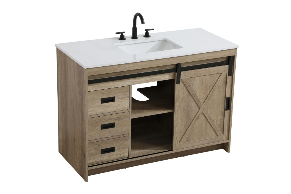 Transform your bathroom with this rustic barnyard-style vanity, designed to balance aesthetic appeal and functionality. Featuring a sliding barn door with black metal hardware and complementary handle pulls, this piece blends rugged charm with practical design. The engineered marble countertop displays unique marbling, while the porcelain undermount sink offers easy maintenance and durability. Available in Espresso, Natural Oak, and Rustic Grey finishes, this vanity suits a range of styles. It includes a deep storage drawer for larger items, a hidden shelf for towels or décor, and adjustable foot levelers for added stability on uneven floors. With pre-drilled faucet holes for easy setup, this vanity delivers style and substance to enhance your bathroom.