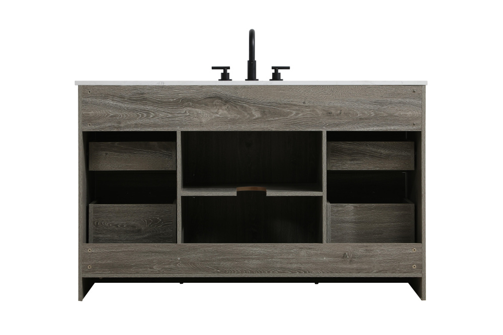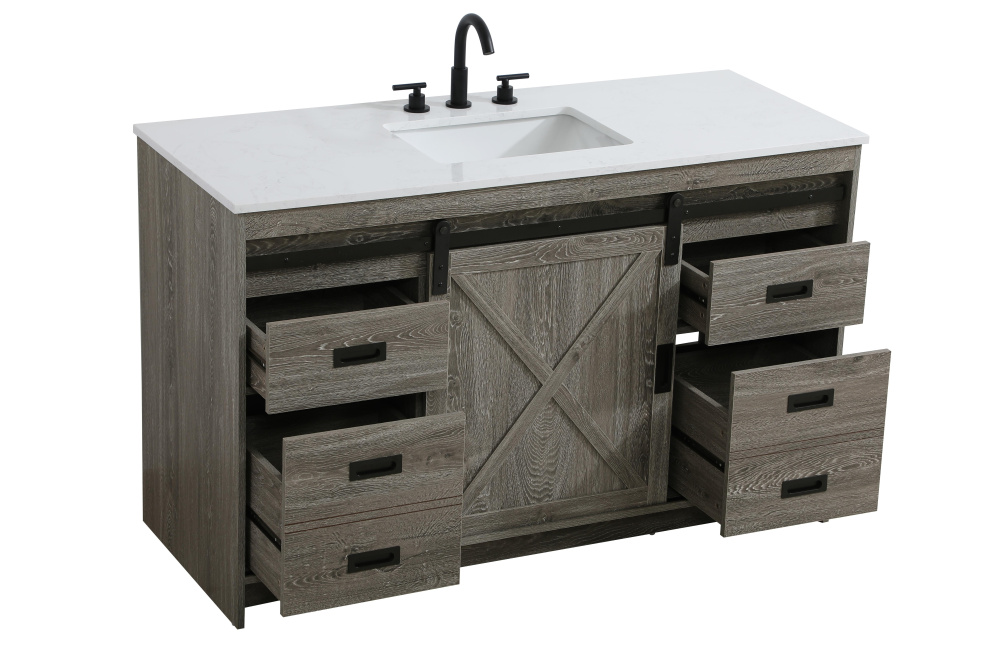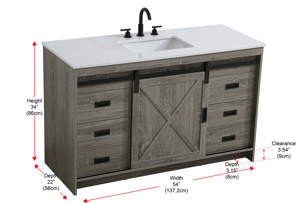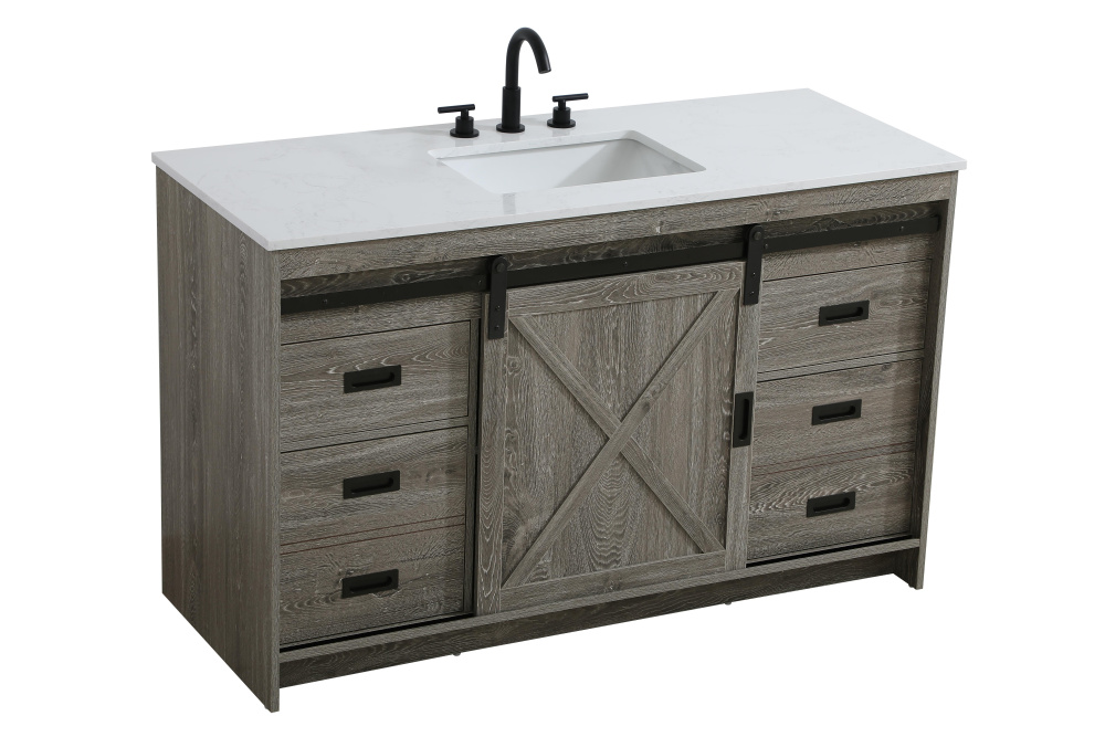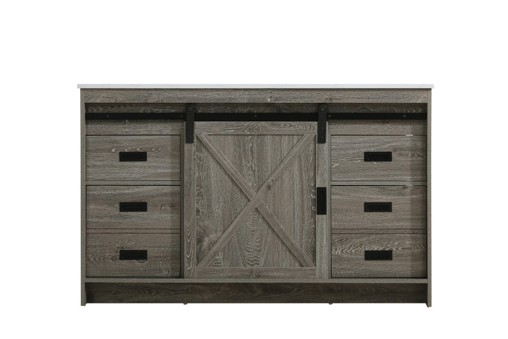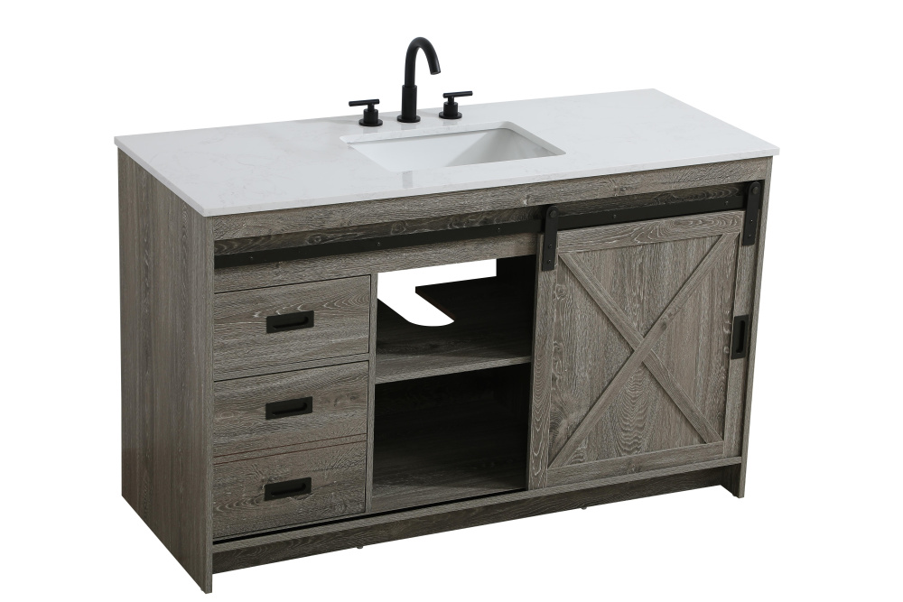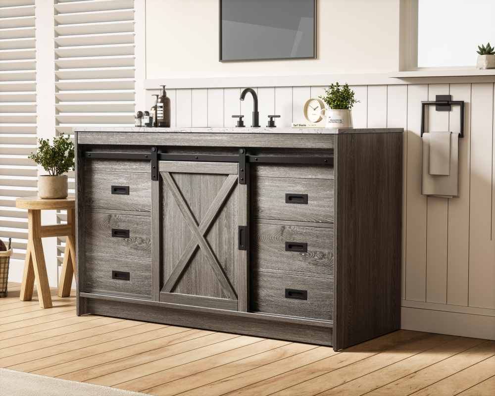 Transform your bathroom with this rustic barnyard-style vanity, designed to balance aesthetic appeal and functionality. Featuring a sliding barn door with black metal hardware and complementary handle pulls, this piece blends rugged charm with practical design. The engineered marble countertop displays unique marbling, while the porcelain undermount sink offers easy maintenance and durability. Available in Espresso, Natural Oak, and Rustic Grey finishes, this vanity suits a range of styles. It includes a deep storage drawer for larger items, a hidden shelf for towels or décor, and adjustable foot levelers for added stability on uneven floors. With pre-drilled faucet holes for easy setup, this vanity delivers style and substance to enhance your bathroom.