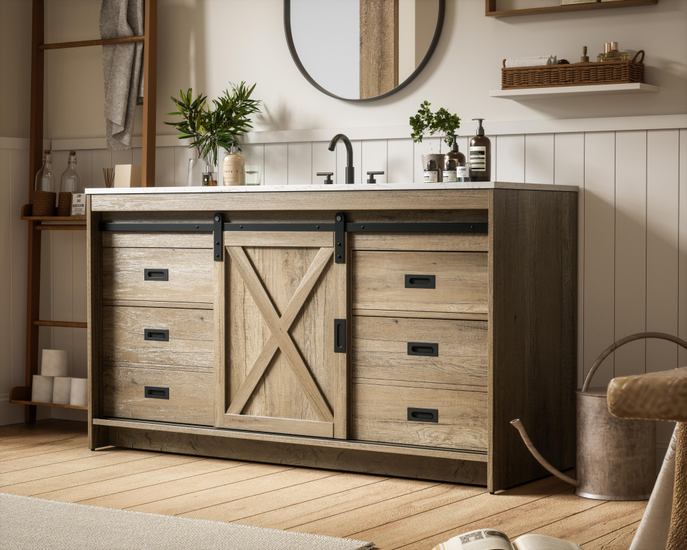 Transform your bathroom with this rustic barnyard-style vanity, designed to balance aesthetic appeal and functionality. Featuring a sliding barn door with black metal hardware and complementary handle pulls, this piece blends rugged charm with practical design. The engineered marble countertop displays unique marbling, while the porcelain undermount sink offers easy maintenance and durability. Available in Espresso, Natural Oak, and Rustic Grey finishes, this vanity suits a range of styles. It includes a deep storage drawer for larger items, a hidden shelf for towels or décor, and adjustable foot levelers for added stability on uneven floors. With pre-drilled faucet holes for easy setup, this vanity delivers style and substance to enhance your bathroom.