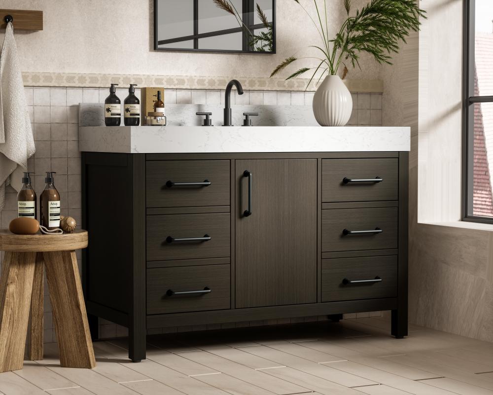 This bathroom vanity embodies a sleek, modern design with a strong, minimalist appeal. The deep mocha brown finish enhances the bold and sophisticated appearance, while the flat-panel doors and drawer fronts contribute to its clean, structured aesthetic. The wood's dark tone adds depth and richness, making it a striking focal point in any bathroom setting. Its structured design, featuring symmetrical drawers on either side and a centered door, adds balance and organization to the overall aesthetic. Matte black hardware, including slim and cylindrical pulls, contrasts elegantly against the dark wood, reinforcing its contemporary vibe while providing subtle visual interest. The thick engineered marble countertop in crisp white adds a sharp contrast to the dark base, creating a visually dynamic combination that is both functional and stylish. This vanity is perfect for those seeking a design that combines modern simplicity with a touch of bold refinement. This vanity is delivered fully assembled and equipped with foot levelers for effortless installation and stability. The matching backsplash seamlessly integrates with the countertop, offering a cohesive design that protects walls from splashes while maintaining a unified look. Combining practicality and bold design, this vanity is UPC certified and ready to transform your bathroom space.