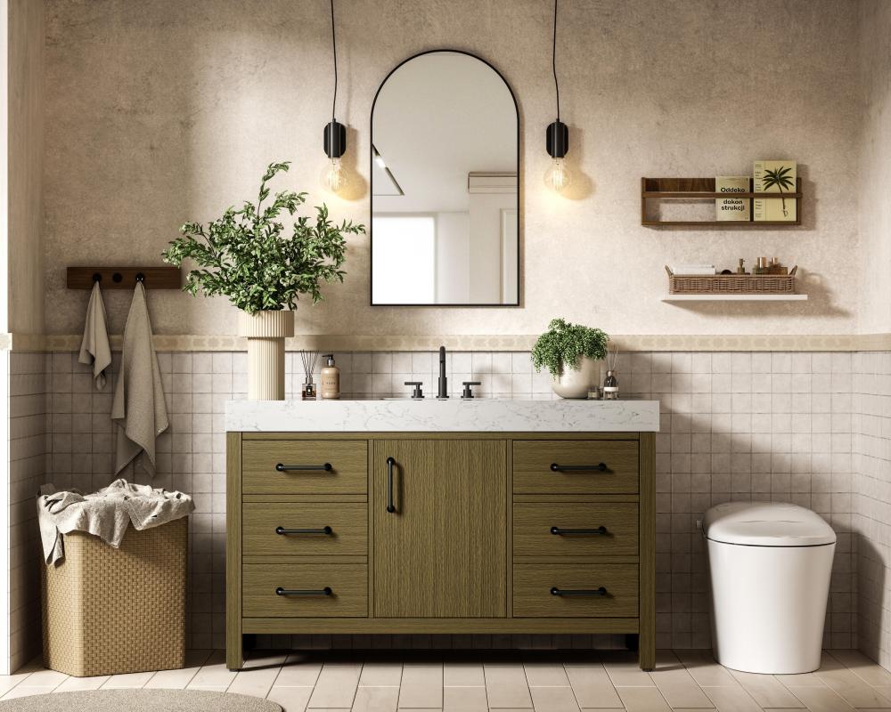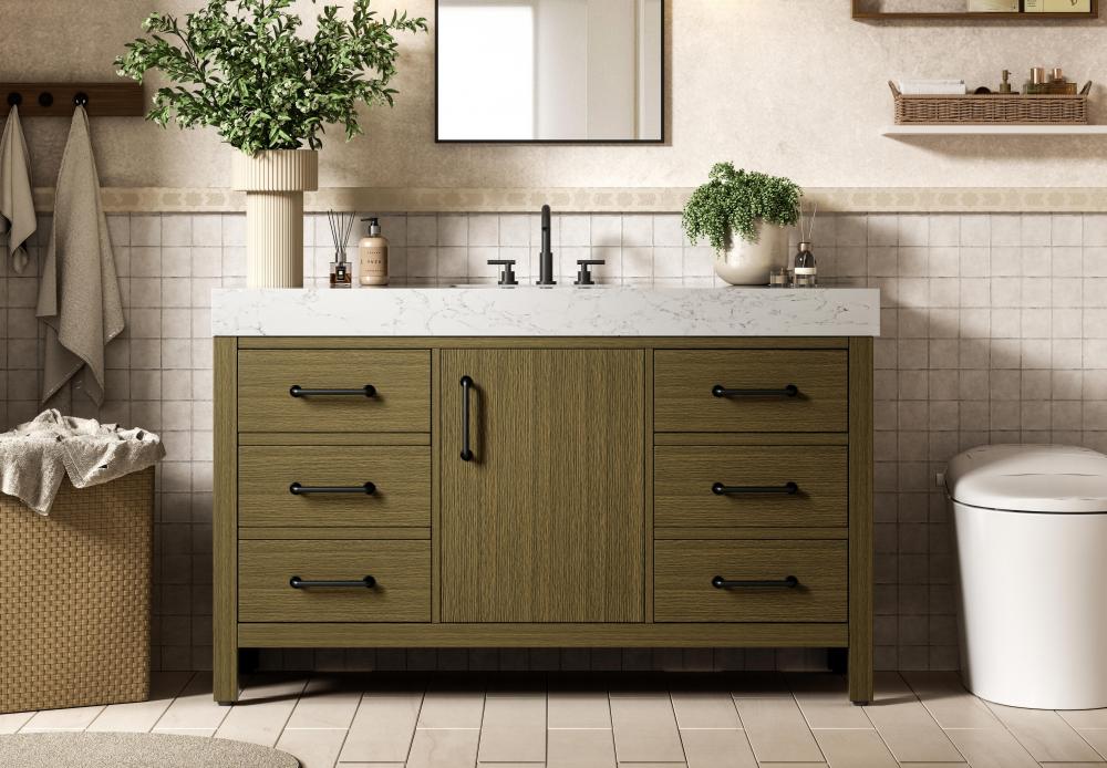 The engineered marble countertop stands out with its bold 4-inch thickness and natural veining, creating a commanding presence in any bathroom.