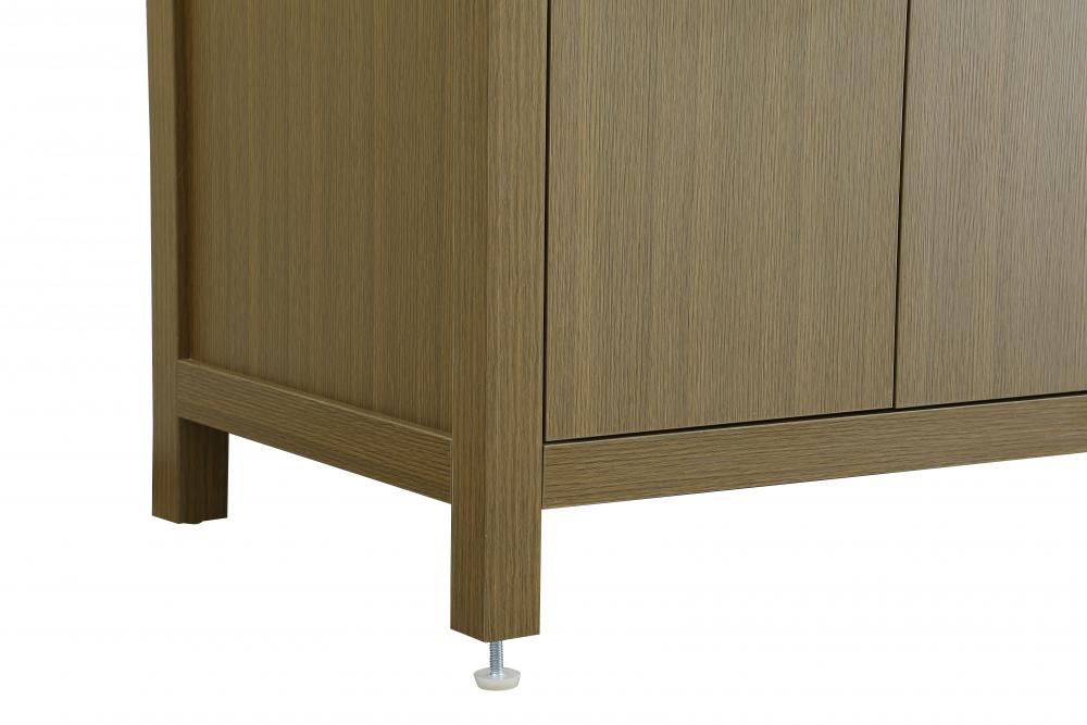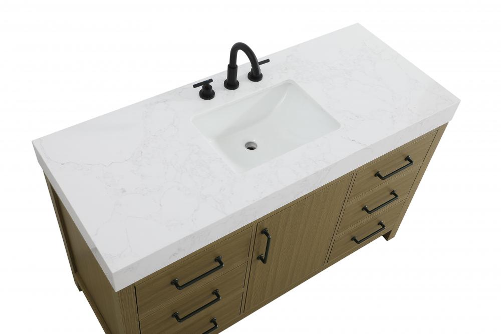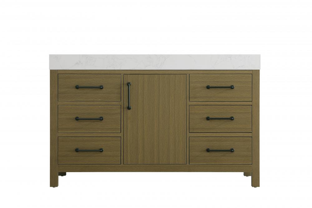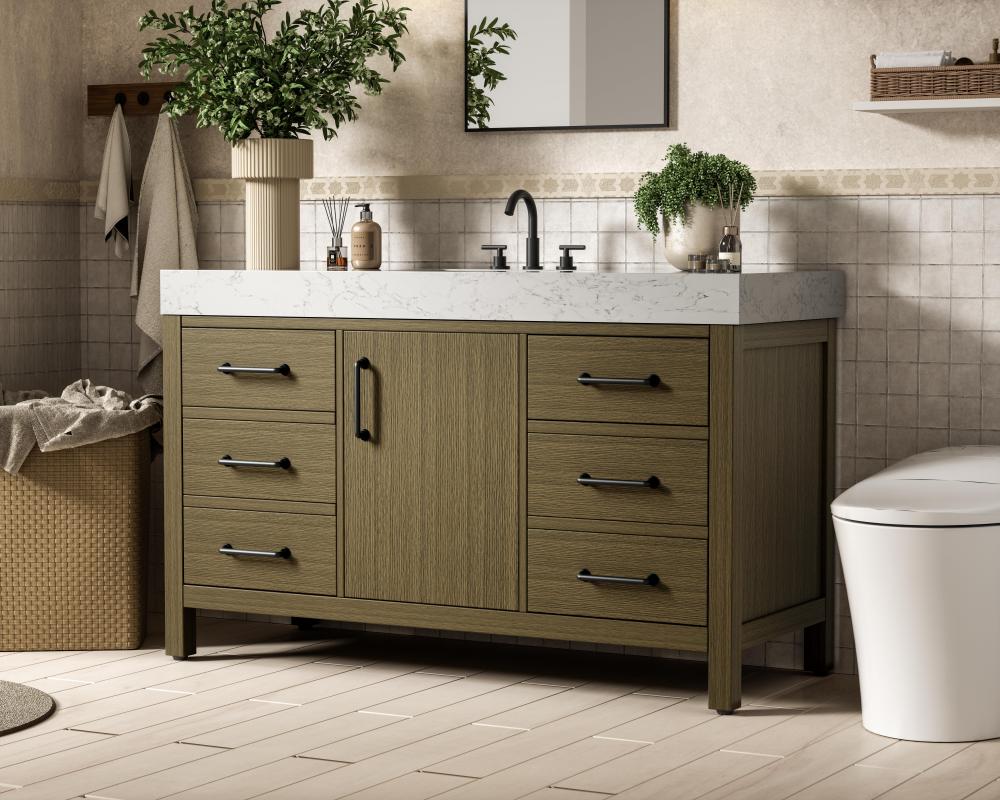 This bathroom vanity embodies a clean, minimalist design, perfectly suited for modern and transitional spaces. Its straight, sleek lines and flat-paneled doors create a refined yet approachable look. The warm, honey-toned finish highlights the subtle wood grain, adding texture and visual interest while maintaining a sense of balance and simplicity. The central drawers and symmetrical cabinet doors create a sense of balance and structure. Matte black hardware offers a bold contrast to the light wood tone, reinforcing the modern aesthetic while maintaining a timeless appeal. The thick engineered marble countertop adds a sturdy, minimalist element, with its clean white surface further elevating the overall sophistication of the vanity. This piece is a perfect marriage of style and practicality, effortlessly complementing both modern and transitional bathroom designs. This vanity is delivered fully assembled and equipped with foot levelers for effortless installation and stability. Combining practicality and bold design, this vanity is UPC certified and ready to transform your bathroom space.