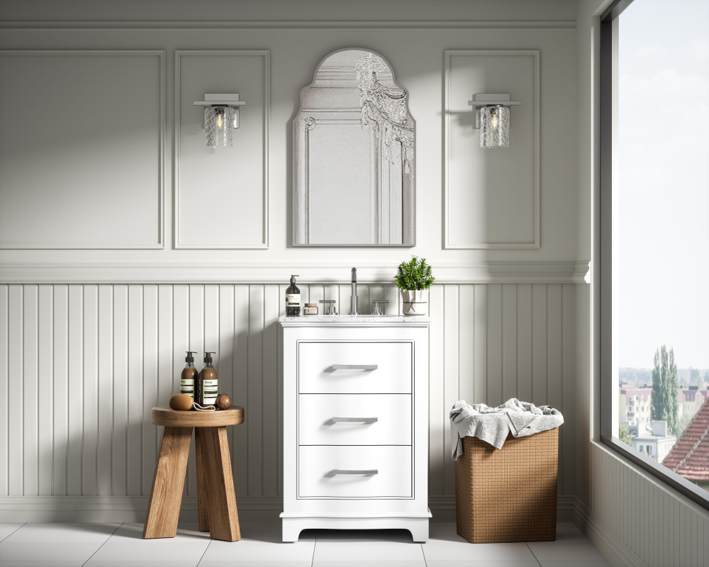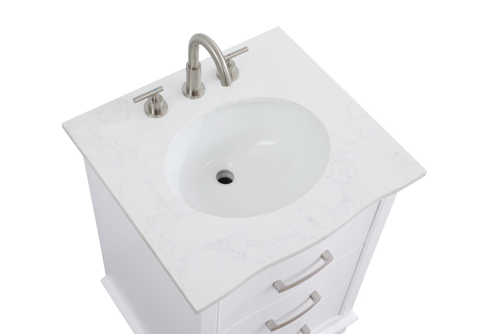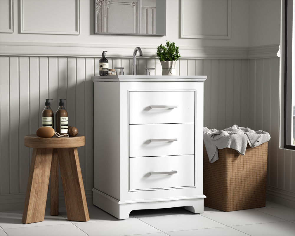 Enhance your bathroom with this expertly crafted vanity that combines functionality and timeless design. The slightly curved silhouette adds softness and sophistication, while the faux-marble countertop showcases unique veining for a one-of-a-kind look. Complete with a porcelain undermount sink, this vanity is available in White, Blue, and Grey finishes to complement any décor. Soft-closing drawers offer quiet and smooth storage access, including a U-shaped middle drawer designed to fit around plumbing. Built with solid wood and MDF for lasting durability, it also features adjustable foot levelers for stability and ships fully assembled, making it an effortless and stylish upgrade to your space.
