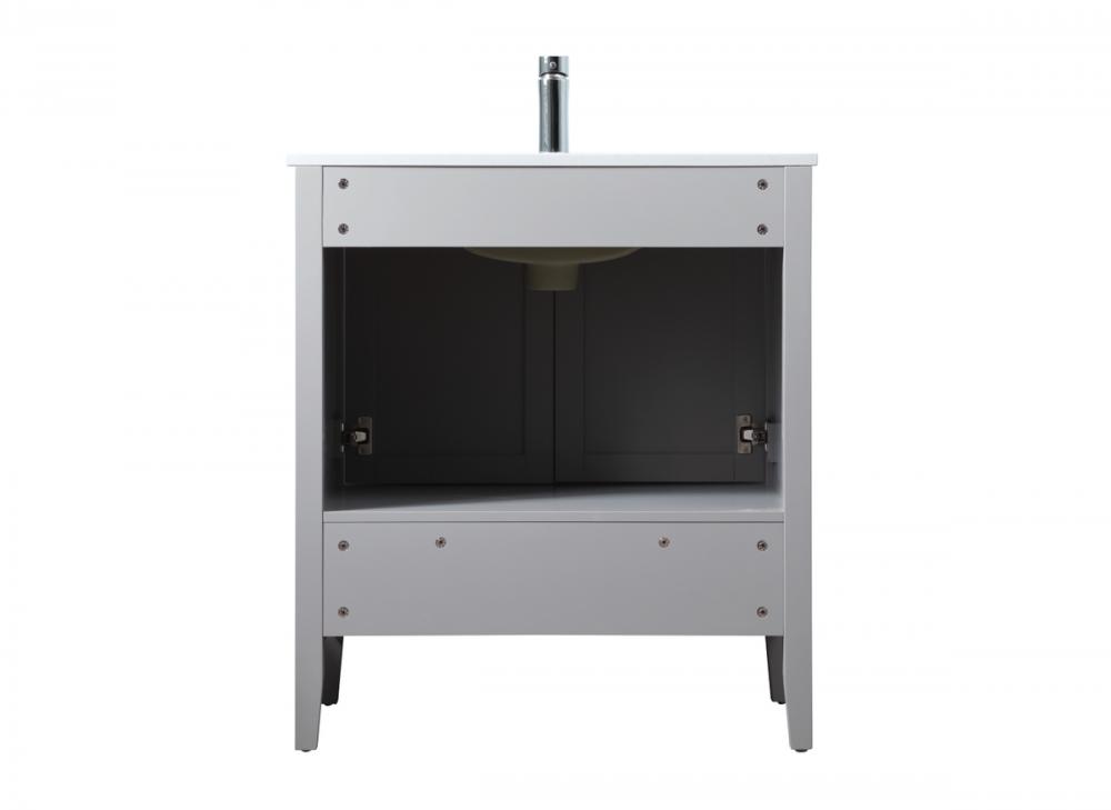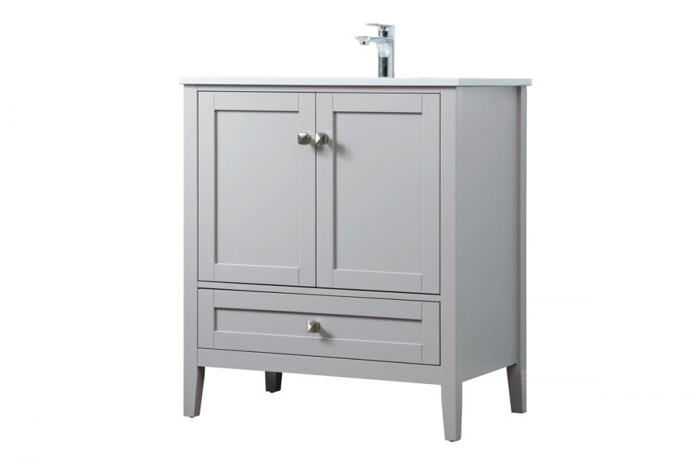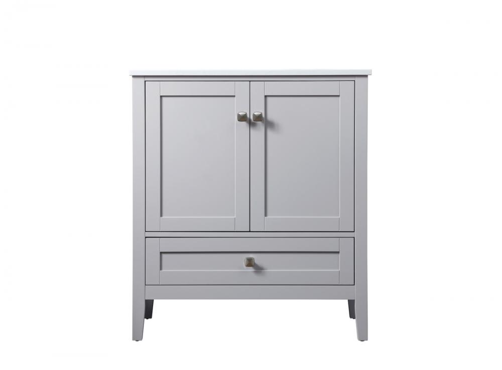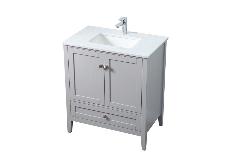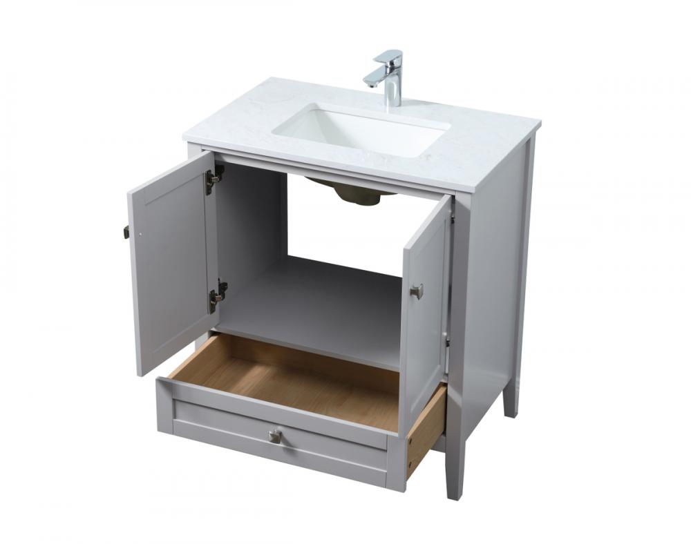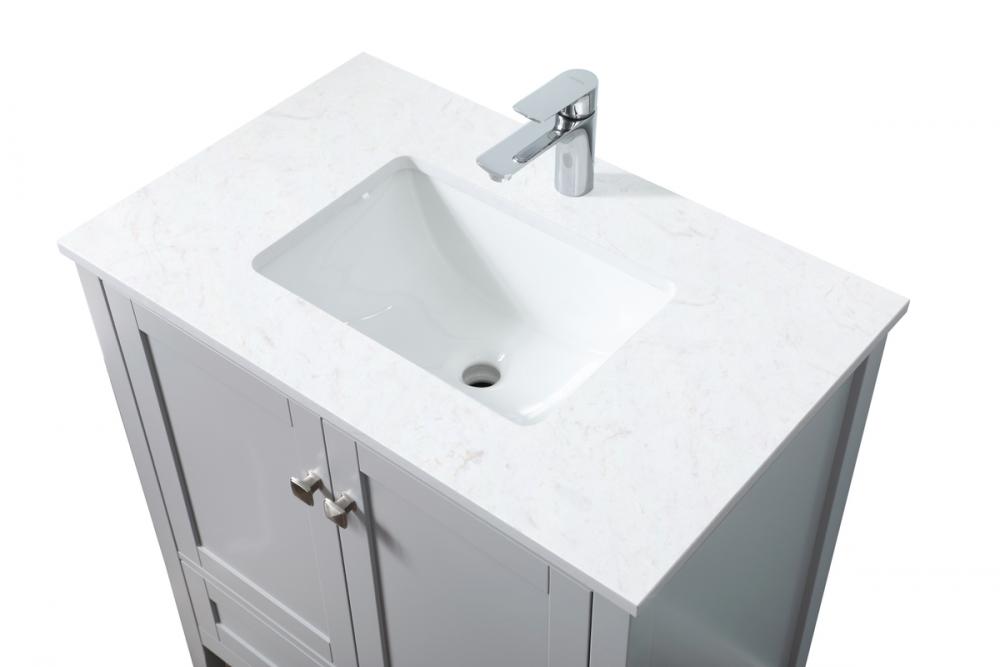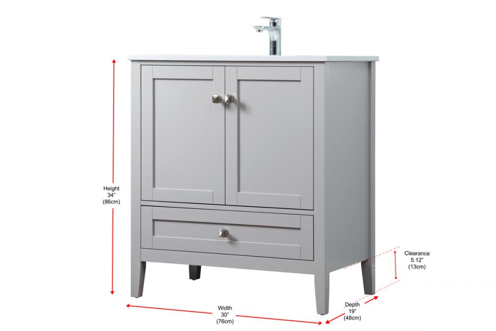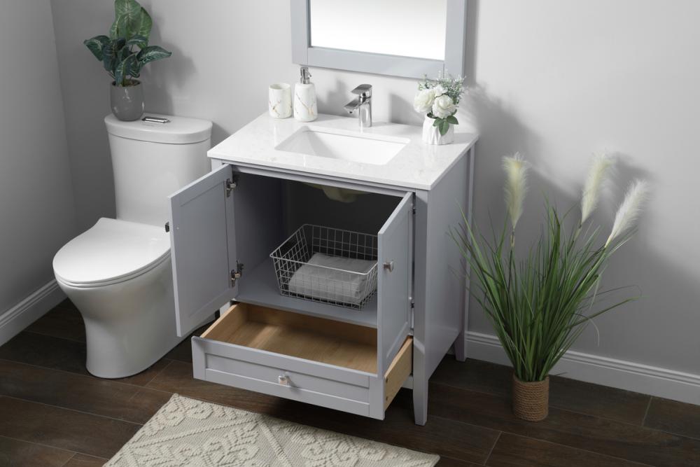 Elevate your bathroom with our precision-crafted 30-inch vanity, showcasing a chic straight edge cut and an engineered marble top that adds a dash of modern elegance to your space. The design features a spacious cabinet with soft-close hinges, paired with a functional soft-close bottom drawer, providing ample and stylish storage. Complete with a sophisticated undermount porcelain sink, the vanity seamlessly merges style and practicality for an elevated bathroom experience. Adorned with three brushed nickel knobs, our vanity boasts stylish hardware, adding a personalized touch and ensuring convenient access to storage. Additionally, with a single pre-drilled hole for seamless faucet installation, our versatile vanity allows you to effortlessly personalize your bathroom, adding a final touch of elegance to your unique space. Redefine your bathroom experience with this stylish and functional addition.