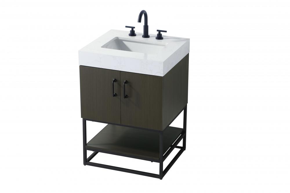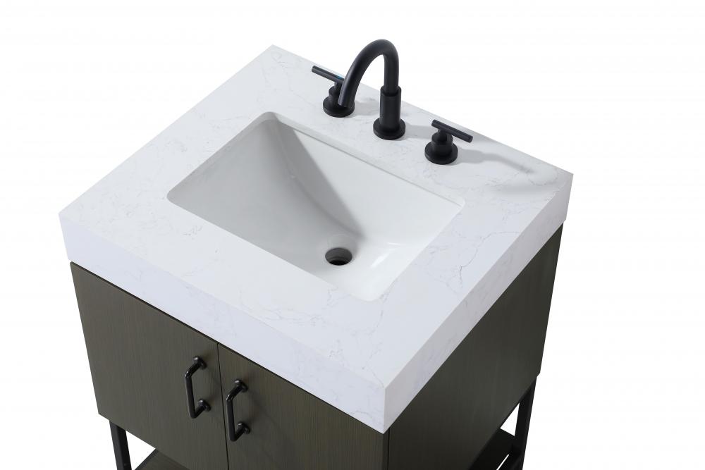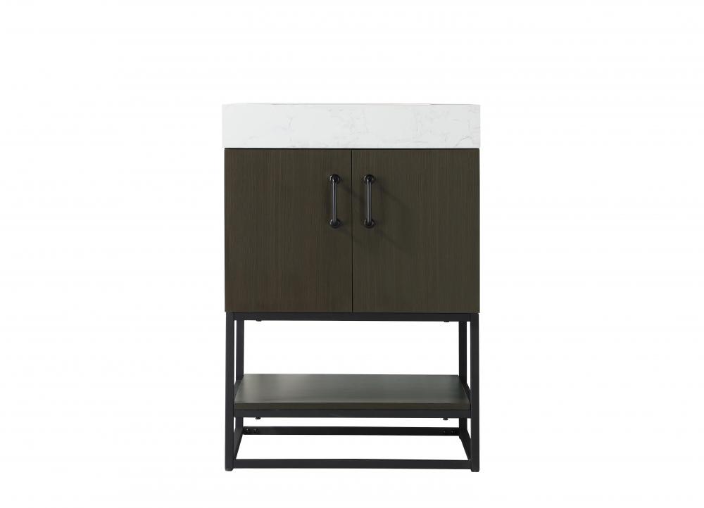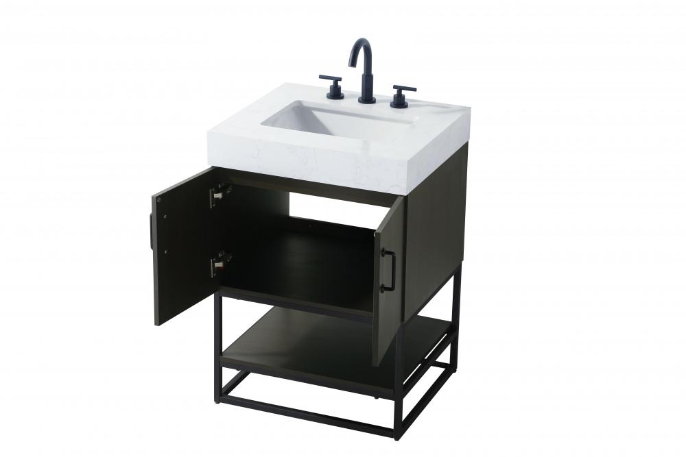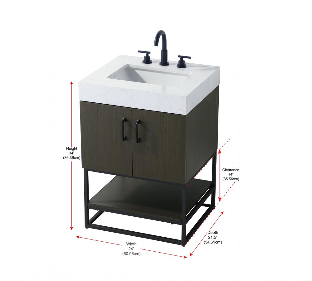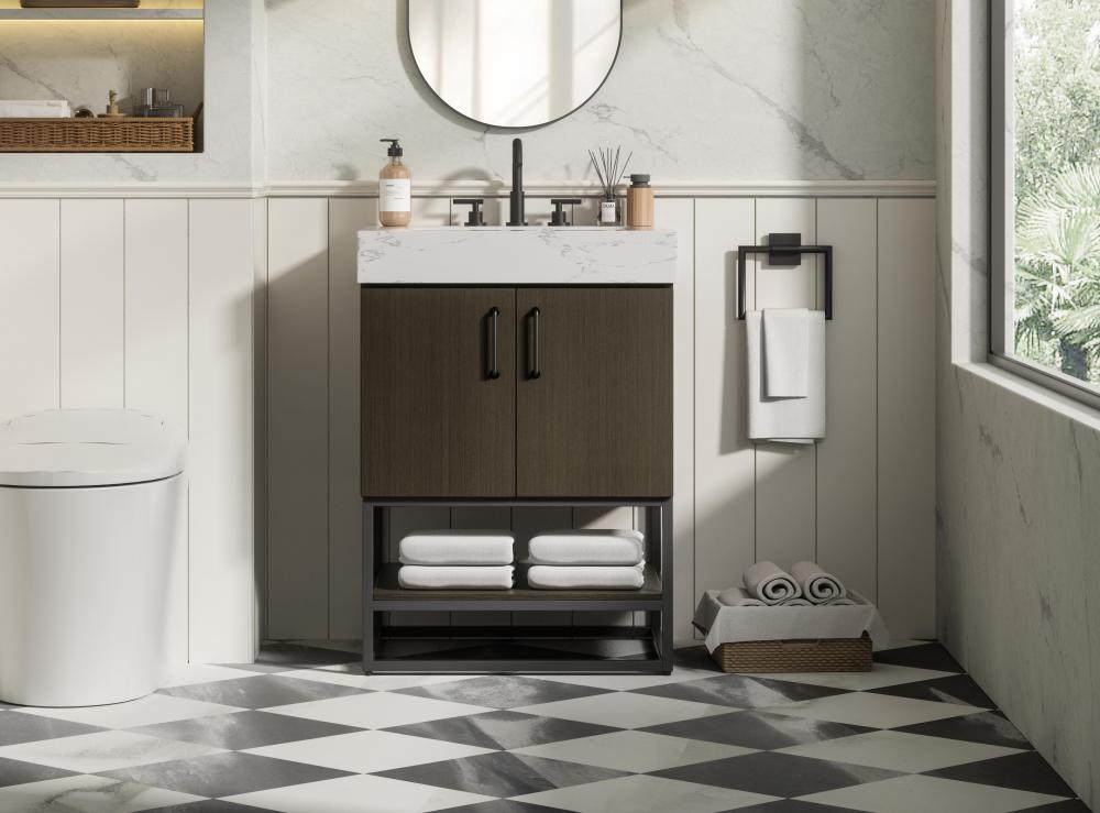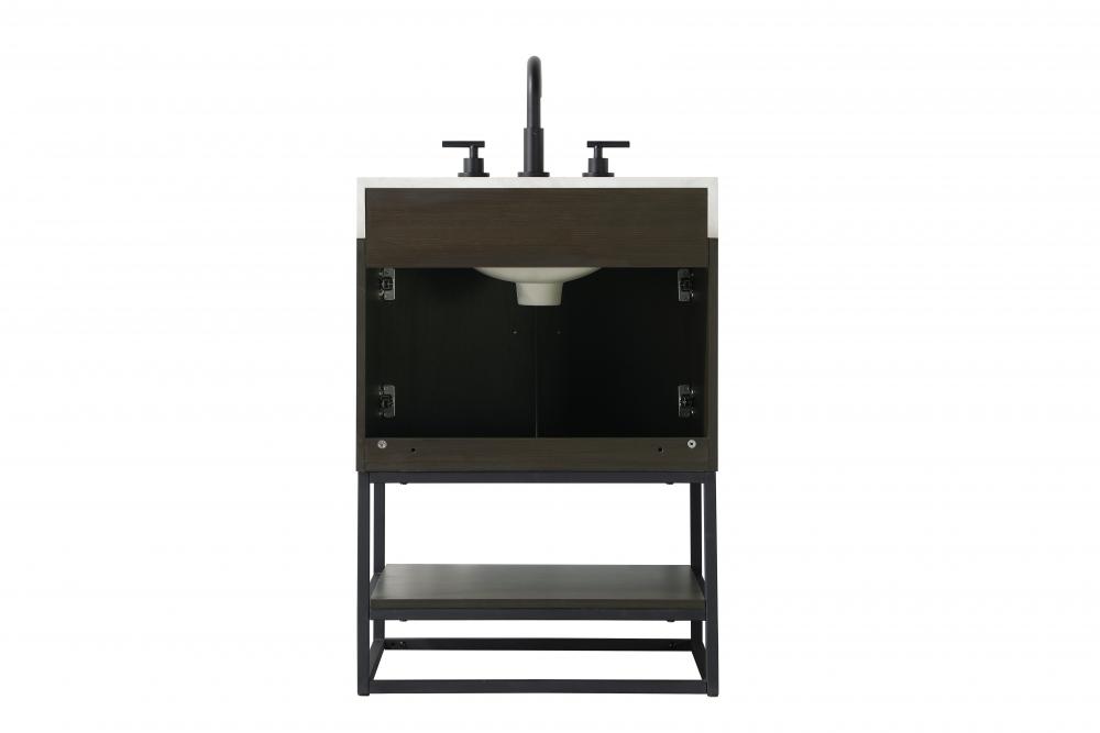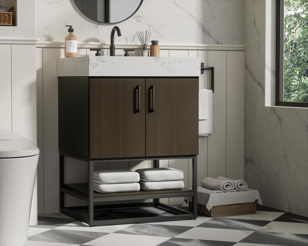 Upgrade your bathroom with this stylish transitional vanity, available in five stunning finishes, from crisp white to warm honey brown, designed to suit a variety of decor styles. The minimalist flat door panels and open wood shelf create a functional yet visually appealing storage solution, while the slender black metal legs elevate the look with modern sophistication. The 4-inch thick white engineered marble countertop, accented with natural veining, adds a luxurious touch, perfectly complemented by soft-closing doors with sleek black metal bar pulls. Thoughtful details like the concealed overflow, back panel cutout for plumbing, and 3 pre-drilled holes for an 8-inch faucet make installation easy and efficient. with a porcelain sink and farmhouse-inspired touches, this vanity brings both elegance and practicality to any bathroom setting.