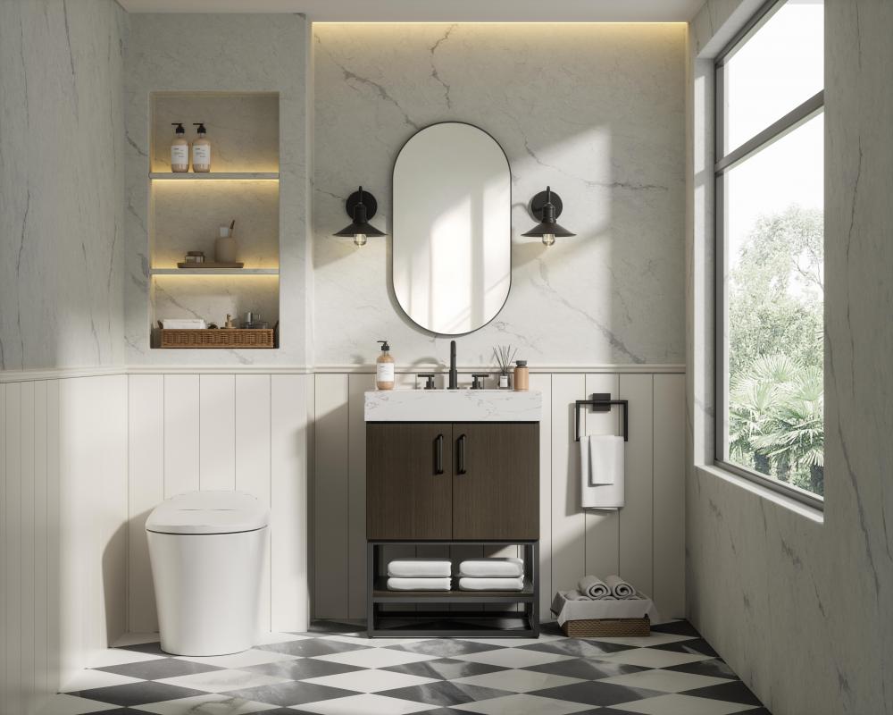 Flat panel designs create a minimalist and modern look, giving the vanity clean lines while maintaining a subtle, farmhouse-inspired charm.