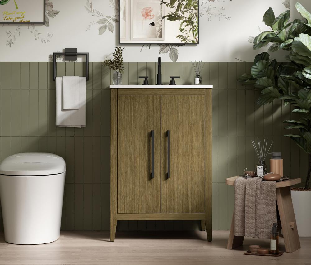 The minimalist flat door panels create a sleek, modern appearance, perfect for blending into transitional and contemporary bathroom designs.