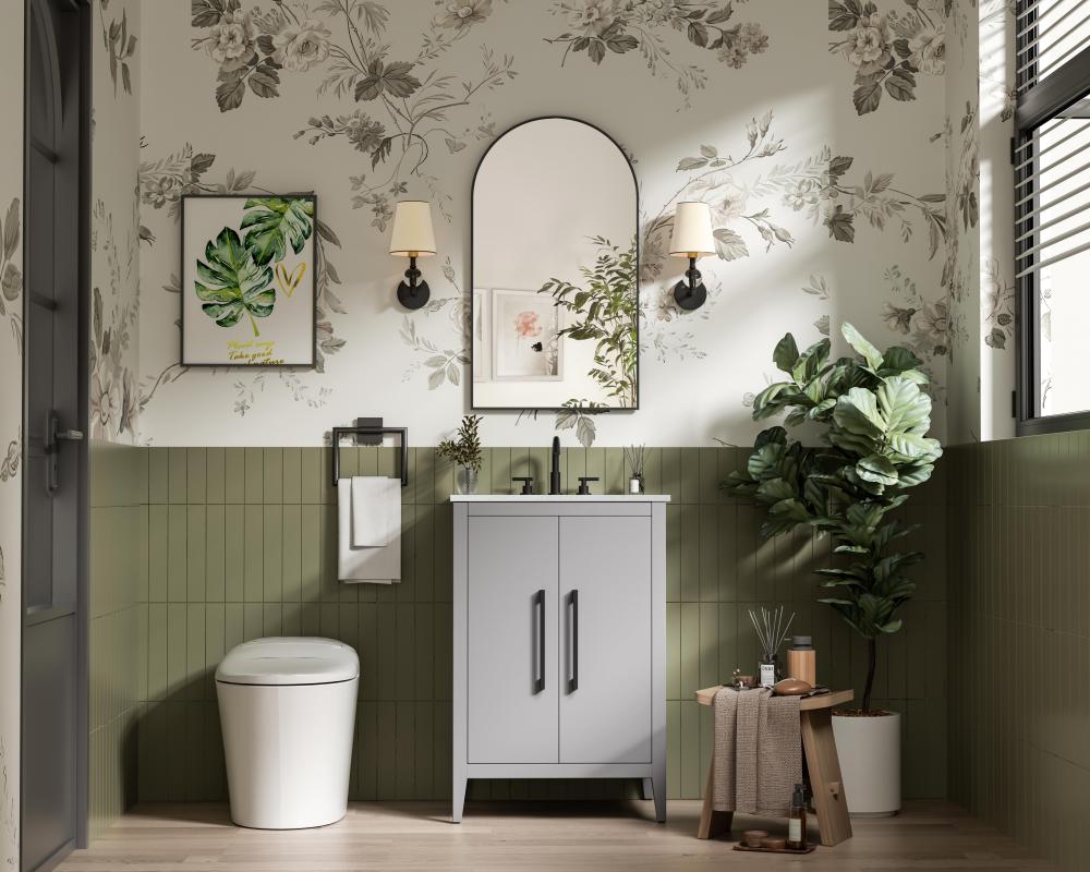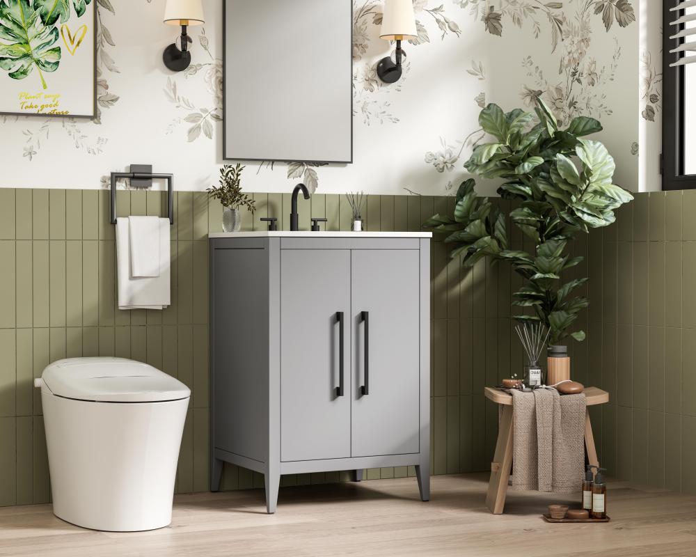 Bring both elegance and practicality to your bathroom with this transitional vanity, available in a selection of rich finishes that highlight the beauty of faux wood grain in shades of mocha, chestnut, and honey, along with classic white and modern grey. The flat door panels and sleek black metal pulls create a minimalist yet refined aesthetic, while the soft-closing drawers and tapered legs with levelers provide smooth, functional operation. Topped with a luxurious white engineered marble countertop and featuring a porcelain sink, this vanity combines timeless style with modern efficiency. Thoughtfully designed with U-shaped cutout for plumbing, it offers ample storage and easy installation, making it the perfect centerpiece for any bathroom.
