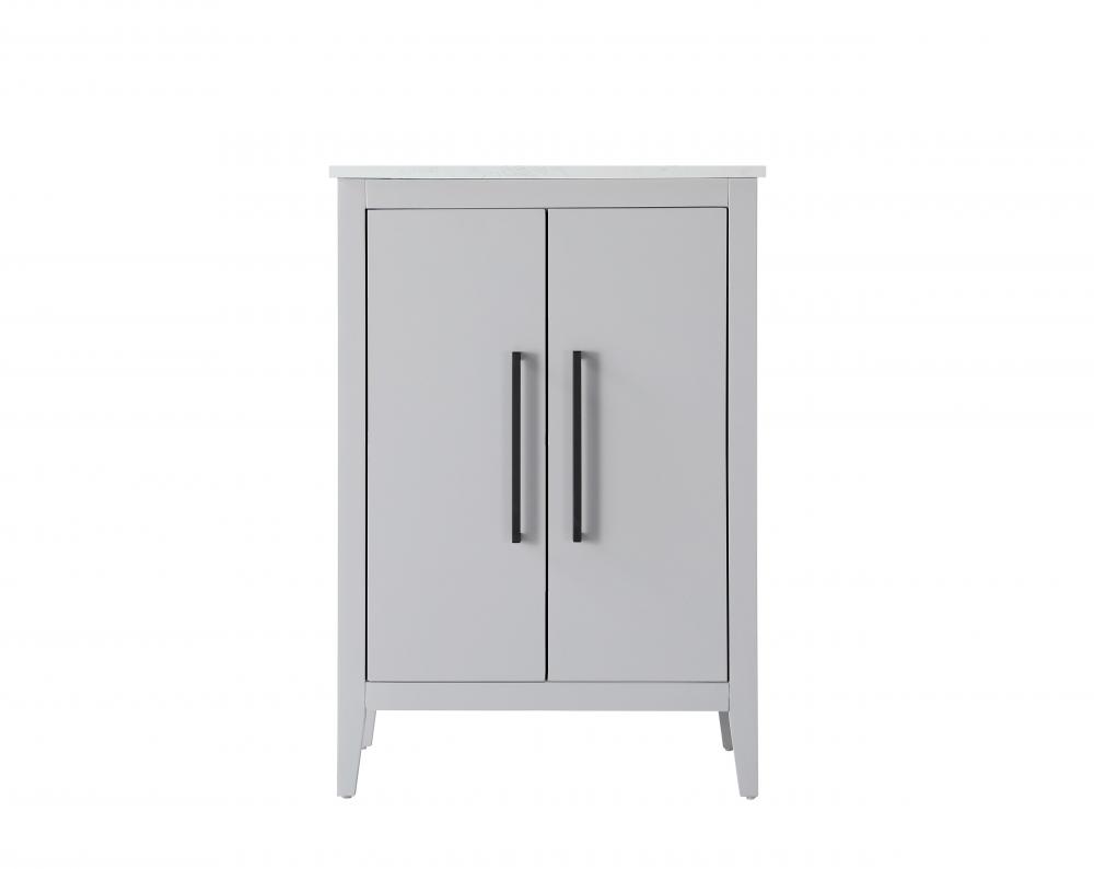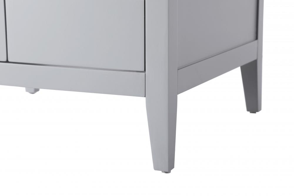 The vanity stands on tapered 5-inch solid wood legs with levelers for a balanced, polished look, combining modern style with practicality.