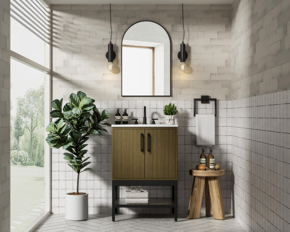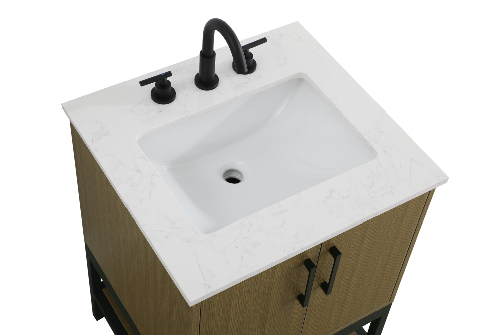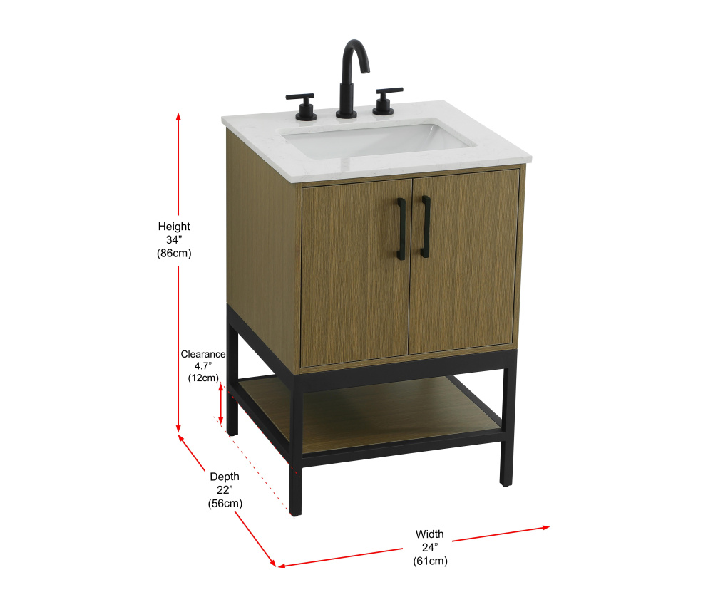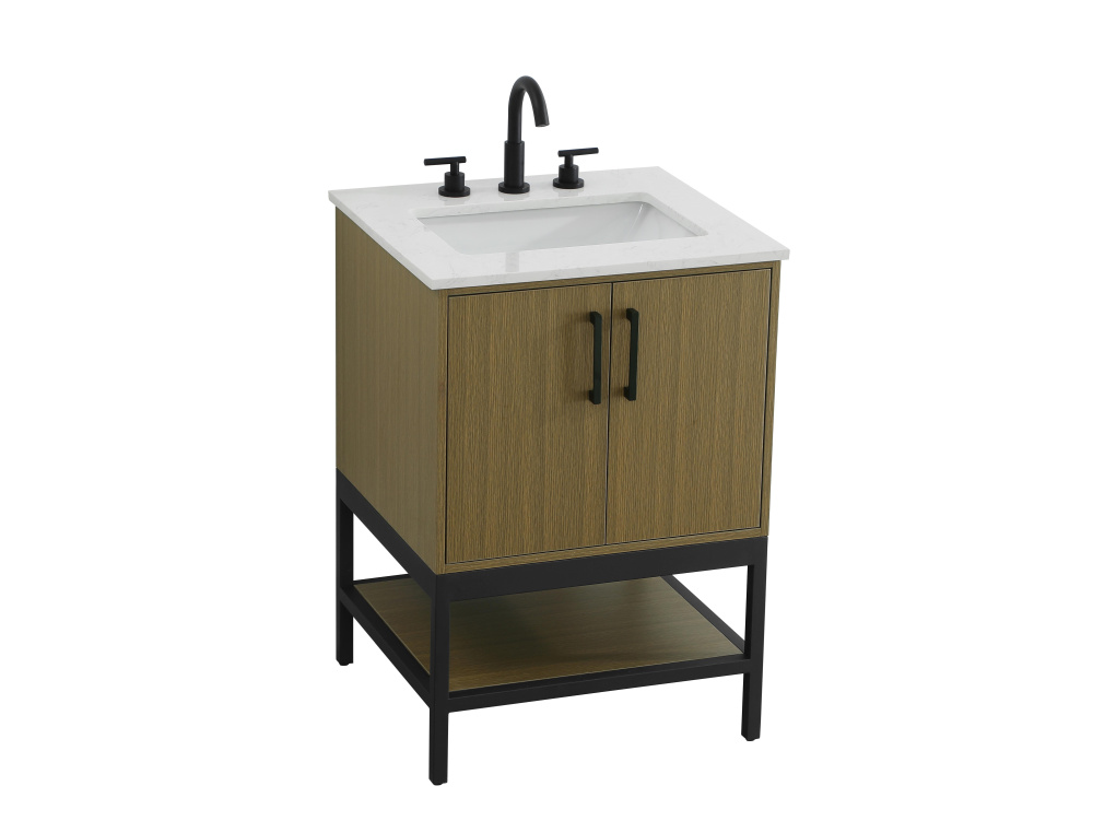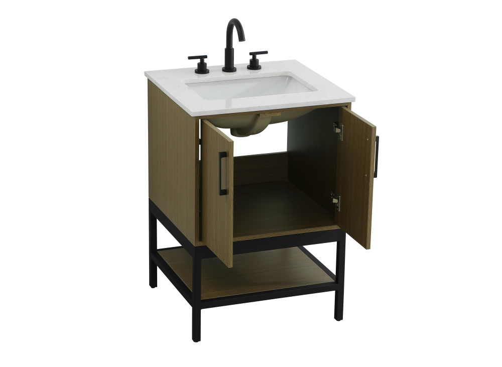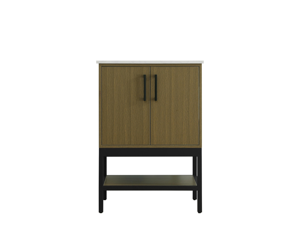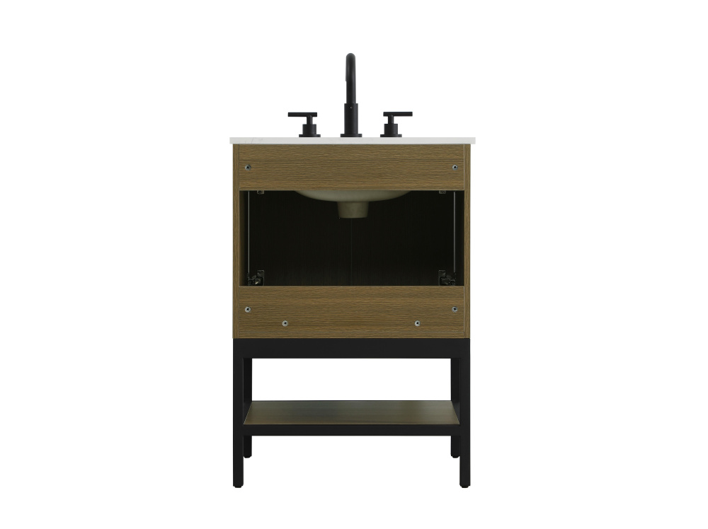 Upgrade your bathroom with this modern bathroom vanity that combines form and function effortlessly. Its sleek wood veneer cabinetry, paired with a bold black metal frame, brings a clean, contemporary vibe to any space. Designed with practicality in mind, the cabinet organizes your essentials, as well as an open lower shelf for added storage or display. The durable engineered marble countertop is built to withstand daily use, while the undermount porcelain sink ensures easy maintenance. Complete with matte black hardware and pre-drilled features for effortless installation, this vanity is the perfect centerpiece to refresh your bathroom with style and efficiency.