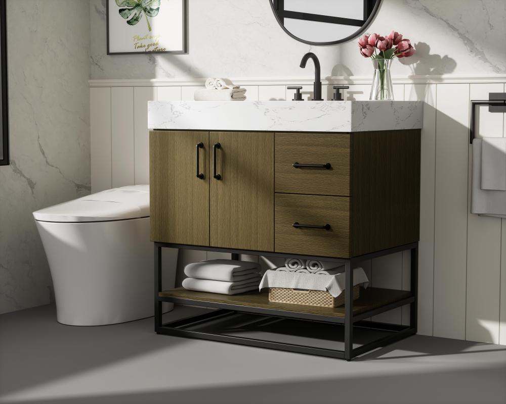Upgrade your bathroom with this stylish transitional vanity, available in five stunning finishes, from crisp white to warm honey brown, designed to suit a variety of decor styles. The minimalist flat door panels and open wood shelf create a functional yet visually appealing storage solution, while the slender black metal legs elevate the look with modern sophistication. The 4-inch thick white engineered marble countertop, accented with natural veining, adds a luxurious touch, perfectly complemented by soft-closing doors with sleek black metal bar pulls. Thoughtful details like the concealed overflow, back panel cutout for plumbing, and 3 pre-drilled holes for an 8-inch faucet make installation easy and efficient. with a porcelain sink and farmhouse-inspired touches, this vanity brings both elegance and practicality to any bathroom setting.