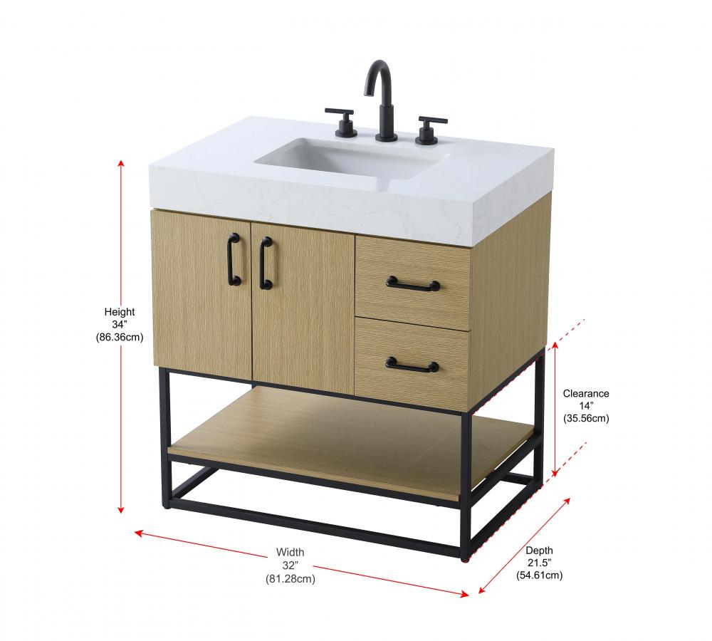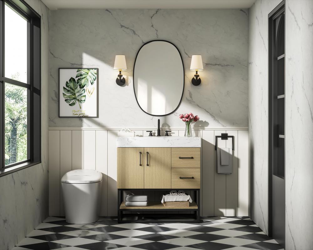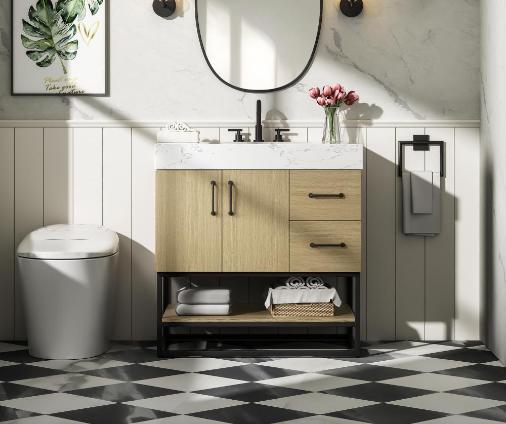 Upgrade your bathroom with this stylish transitional vanity, available in five stunning finishes, from crisp white to warm honey brown, designed to suit a variety of decor styles. The minimalist flat door panels and open wood shelf create a functional yet visually appealing storage solution, while the slender black metal legs elevate the look with modern sophistication. The 4-inch thick white engineered marble countertop, accented with natural veining, adds a luxurious touch, perfectly complemented by soft-closing doors with sleek black metal bar pulls. Thoughtful details like the concealed overflow, back panel cutout for plumbing, and 3 pre-drilled holes for an 8-inch faucet make installation easy and efficient. with a porcelain sink and farmhouse-inspired touches, this vanity brings both elegance and practicality to any bathroom setting.