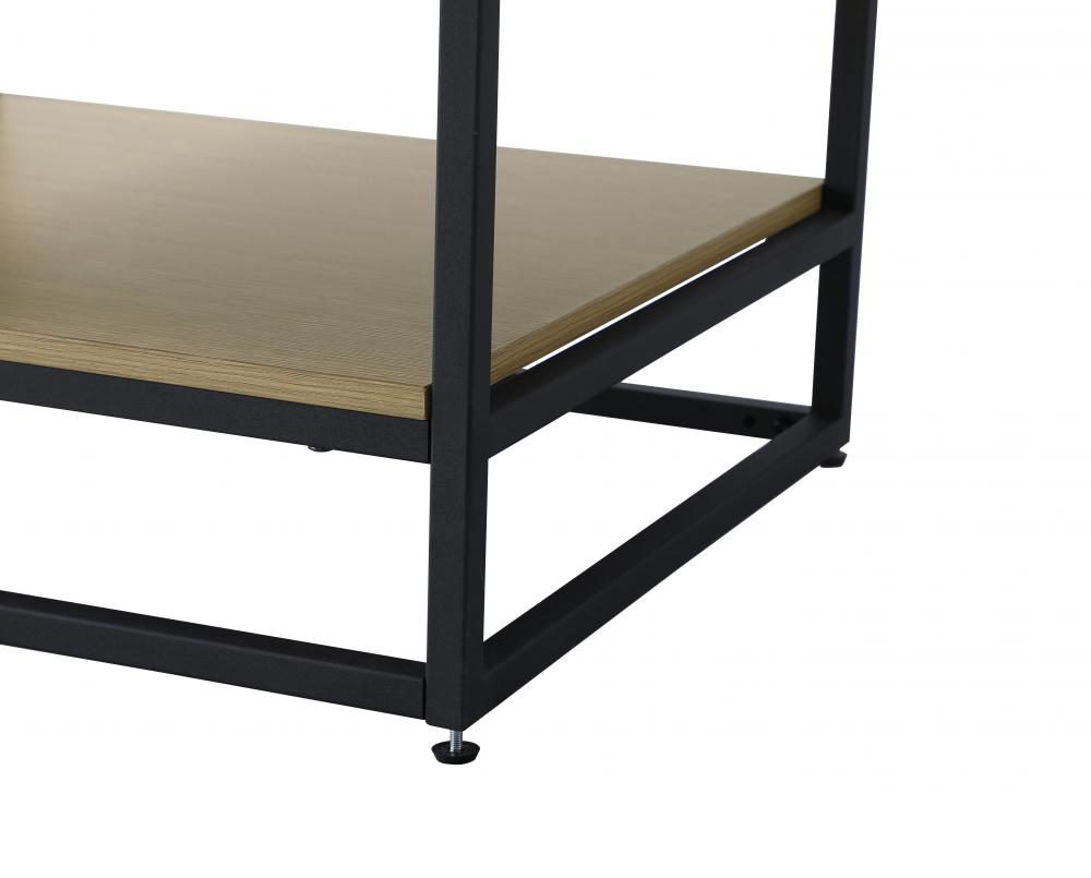 A matching open wood shelf at the bottom provides ample space for storage and decor, supported by slender black metal legs with a 14-inch clearance, combining both practical function and a contemporary edge.