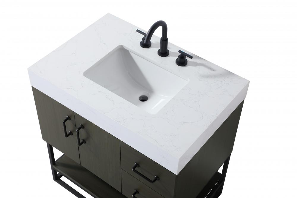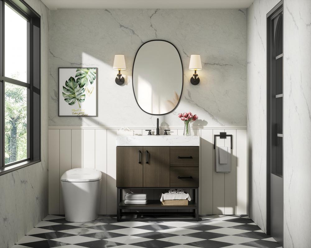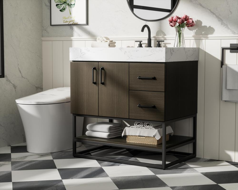 Upgrade your bathroom with this stylish transitional vanity, available in five stunning finishes, from crisp white to warm honey brown, designed to suit a variety of decor styles. The minimalist flat door panels and open wood shelf create a functional yet visually appealing storage solution, while the slender black metal legs elevate the look with modern sophistication. The 4-inch thick white engineered marble countertop, accented with natural veining, adds a luxurious touch, perfectly complemented by soft-closing doors with sleek black metal bar pulls. Thoughtful details like the concealed overflow, back panel cutout for plumbing, and 3 pre-drilled holes for an 8-inch faucet make installation easy and efficient. with a porcelain sink and farmhouse-inspired touches, this vanity brings both elegance and practicality to any bathroom setting.