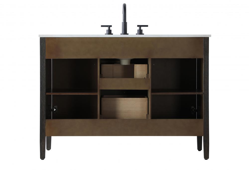 Inside the cabinet, the shelf is thoughtfully designed with a U-shaped cutout to allow for seamless plumbing installation while maintaining storage space.