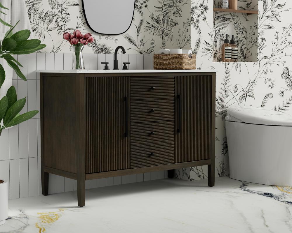 Designed with transitional elegance in mind, this bathroom vanity seamlessly blends traditional elements with modern functionality. Available in five stunning finishes, from the clean sophistication of Crisp White to the natural warmth of Honey Oak, the fluted door and drawer panels add subtle texture and charm. The white engineered marble countertop with natural veining exudes luxury, while the soft-closing doors and drawers with sleek black metal pulls offer a quiet, refined experience. Practicality is never compromised, with features like the U-shaped shelf for plumbing, deeper bottom drawer for ample storage, and pre-drilled faucet holes for easy customization. Whether your style leans modern or classic, this vanity is the perfect balance of beauty and function, appealing to customers with a taste for quality and style.