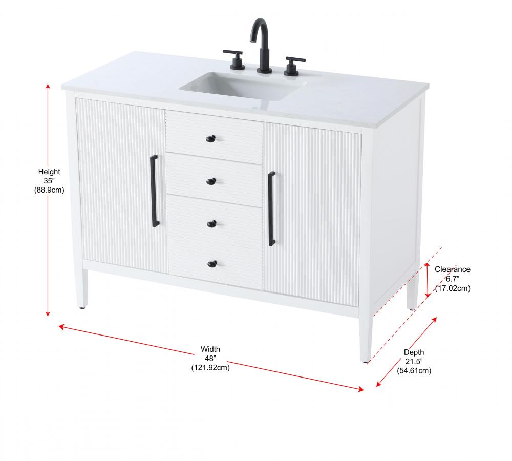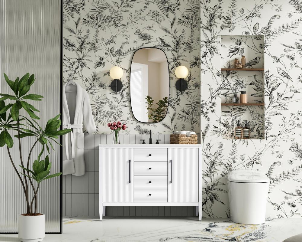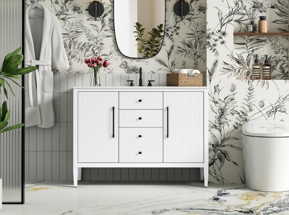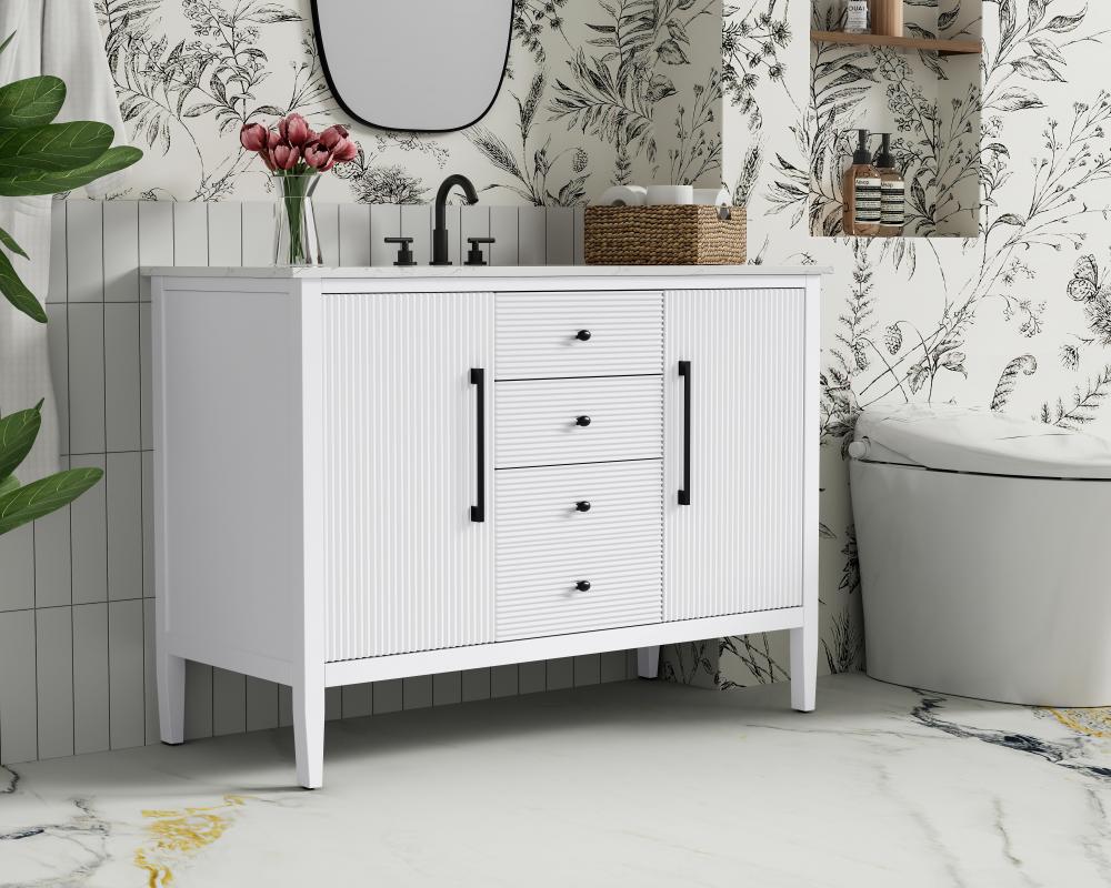 Designed with transitional elegance in mind, this bathroom vanity seamlessly blends traditional elements with modern functionality. Available in five stunning finishes, from the clean sophistication of Crisp White to the natural warmth of Honey Oak, the fluted door and drawer panels add subtle texture and charm. The white engineered marble countertop with natural veining exudes luxury, while the soft-closing doors and drawers with sleek black metal pulls offer a quiet, refined experience. Practicality is never compromised, with features like the U-shaped shelf for plumbing, deeper bottom drawer for ample storage, and pre-drilled faucet holes for easy customization. Whether your style leans modern or classic, this vanity is the perfect balance of beauty and function, appealing to customers with a taste for quality and style.