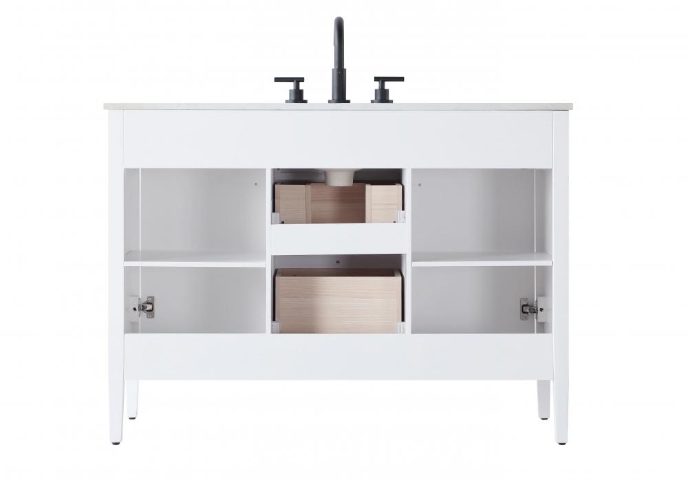 Inside the cabinet, the shelf is thoughtfully designed with a U-shaped cutout to allow for seamless plumbing installation while maintaining storage space.