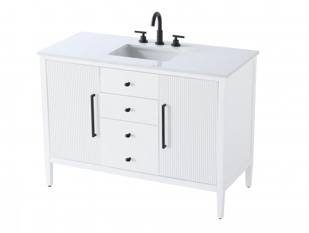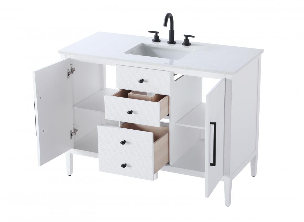 The slender black metal pulls on the doors and the oval-shaped knobs on the drawers provide sleek, modern accents, enhancing the vanity's elegant design.
