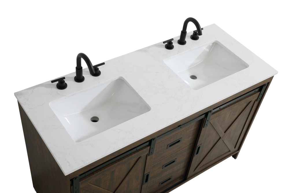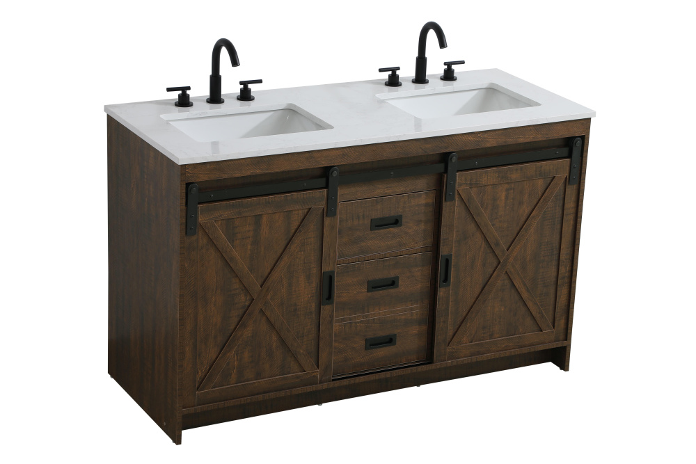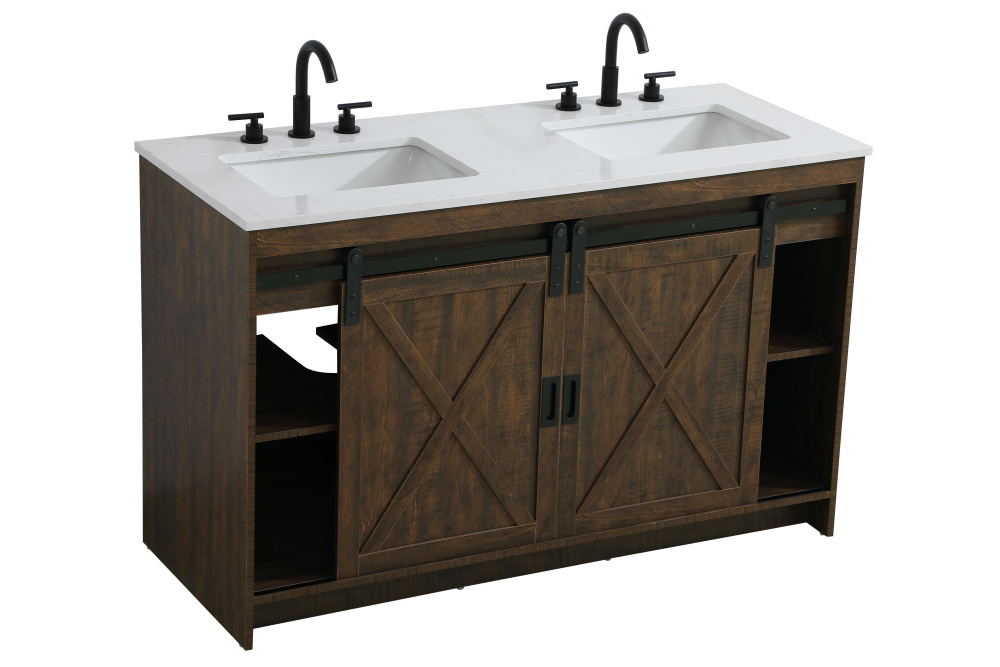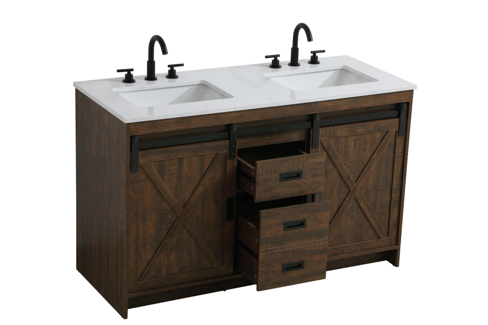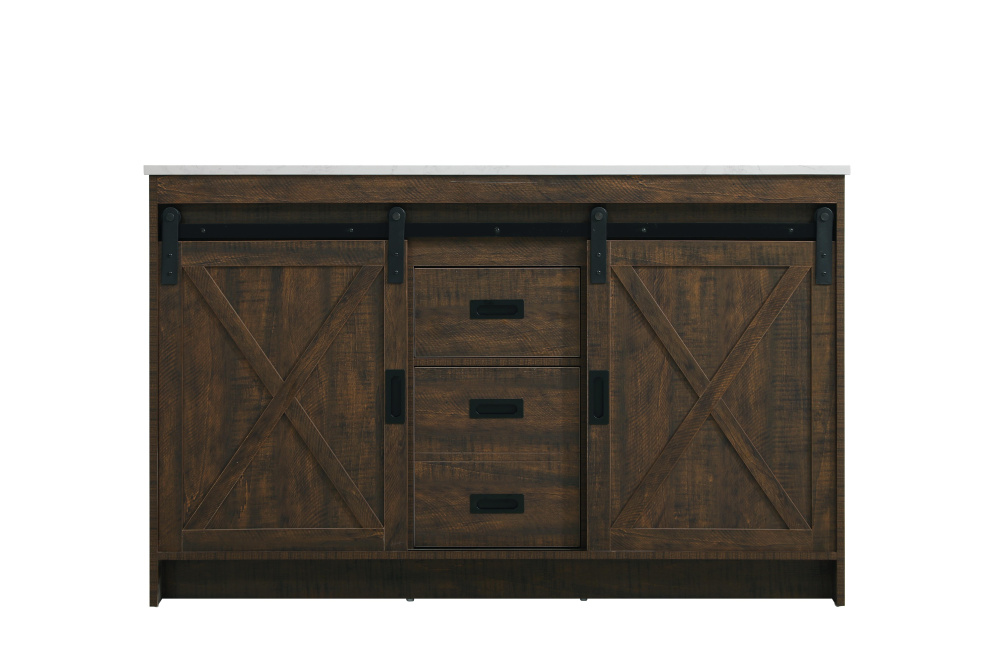 Transform your bathroom with this rustic barnyard-style vanity, designed to balance aesthetic appeal and functionality. Featuring a sliding barn door with black metal hardware and complementary handle pulls, this piece blends rugged charm with practical design. The engineered marble countertop displays unique marbling, while the porcelain undermount sink offers easy maintenance and durability. Available in Espresso, Natural Oak, and Rustic Grey finishes, this vanity suits a range of styles. It includes a deep storage drawer for larger items, a hidden shelf for towels or décor, and adjustable foot levelers for added stability on uneven floors. With pre-drilled faucet holes for easy setup, this vanity delivers style and substance to enhance your bathroom.