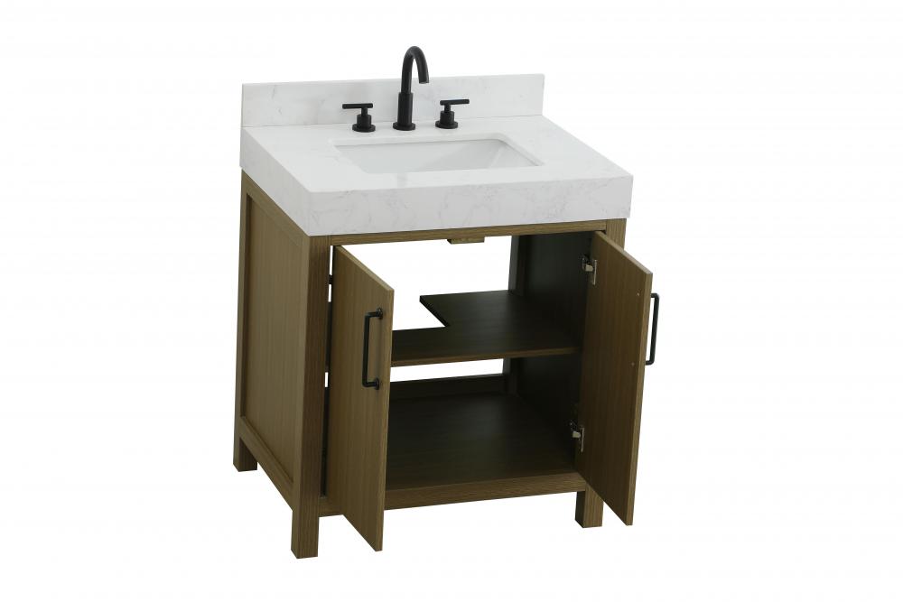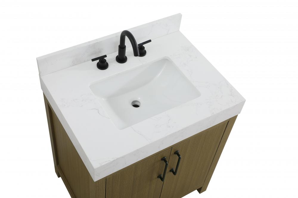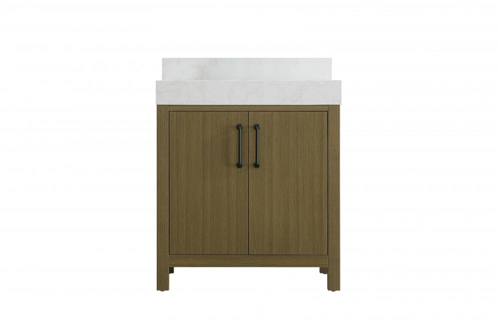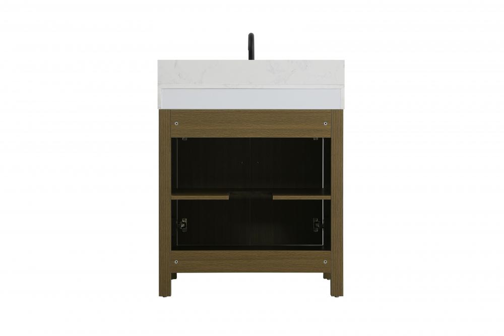 This bathroom vanity embodies a clean, minimalist design, perfectly suited for modern and transitional spaces. Its straight, sleek lines and flat-paneled doors create a refined yet approachable look. The warm, honey-toned finish highlights the subtle wood grain, adding texture and visual interest while maintaining a sense of balance and simplicity. The sturdy rectangular frame, combined with the thick engineered marble countertop, makes a bold and harmonious statement, providing an understated luxury without being overly ornate. Elevate your bathroom functionality with this thoughtfully designed bathroom vanity cabinet. The standout feature is the engineered marble countertop, boasting a bold 4-inch thickness and faux veining for a striking visual appeal. Built from durable solid wood and MDF, this vanity is made to last. The porcelain sink with a concealed overflow maintains a clean and seamless appearance, while the interior is cleverly designed with a U-shaped cutout on the shelf to accommodate plumbing without compromising storage. Soft-closing doors offer convenience and durability, paired with sleek modern handles for a touch of sophistication. This vanity is delivered fully assembled and equipped with foot levelers for effortless installation and stability. Combining practicality and bold design, this vanity is UPC certified and ready to transform your bathroom space. The matching backsplash seamlessly integrates with the countertop, offering a cohesive design that protects walls from splashes while maintaining a unified look.