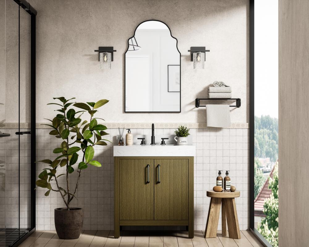 The door pulls are sleek, cylindrical handles in a matte black finish, providing a striking contrast to the warm wood tones of the vanity.