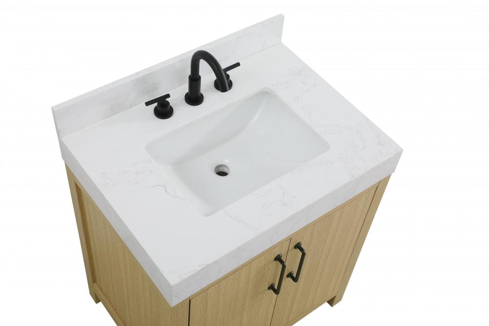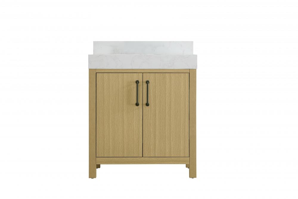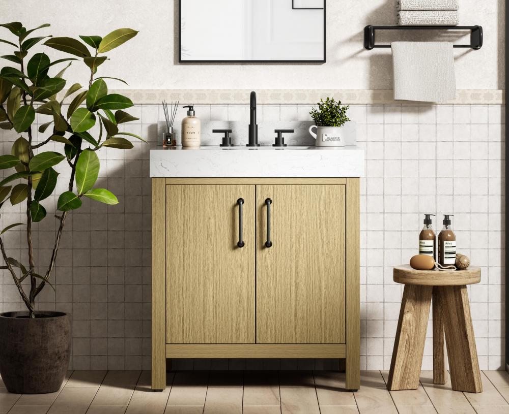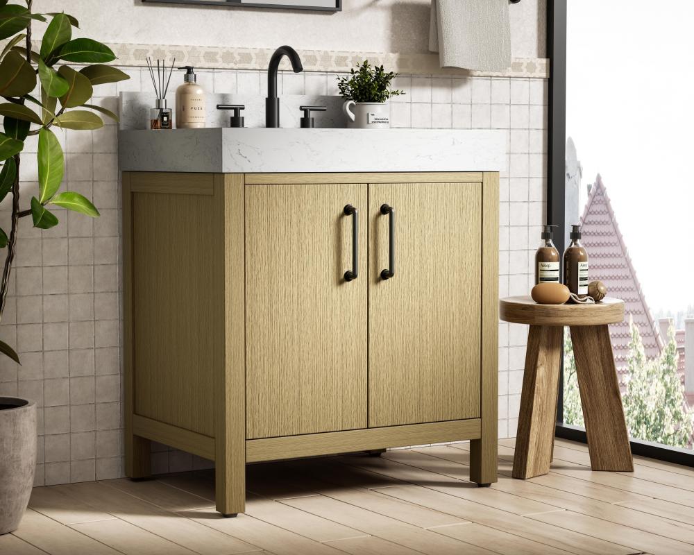 This bathroom vanity showcases a balanced blend of contemporary style and warm, natural-like elements, making it a versatile addition to various interior designs. The clean, straight edges and flat-panel doors lend a modern, streamlined look, while the soft, light wood finish highlights the faux grain pattern, adding warmth and a sense of organic texture to the piece. The vanity features a functional layout, with two cabinet doors, creating a balanced and organized look. Matte black hardware, including slim and cylindrical pulls, contrasts elegantly against the light wood, reinforcing its contemporary vibe while providing subtle visual interest. The thick engineered marble countertop in crisp white adds a sharp contrast to the light base, creating a visually dynamic combination that is both functional and stylish. This vanity is perfect for those seeking a design that combines modern simplicity with a touch of bold refinement. This vanity is delivered fully assembled and equipped with foot levelers for effortless installation and stability. Combining practicality and bold design, this vanity is UPC certified and ready to transform your bathroom space. The matching backsplash seamlessly integrates with the countertop, offering a cohesive design that protects walls from splashes while maintaining a unified look.