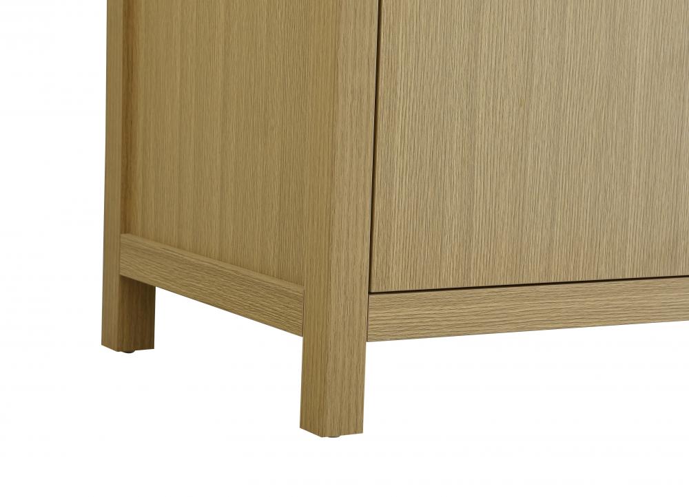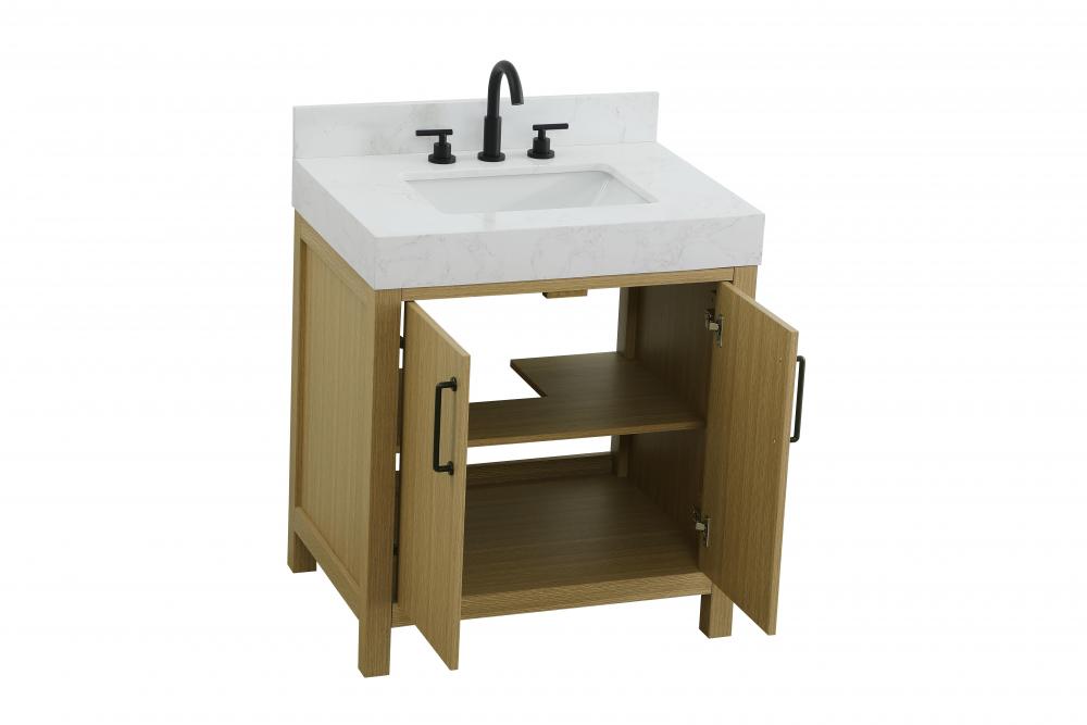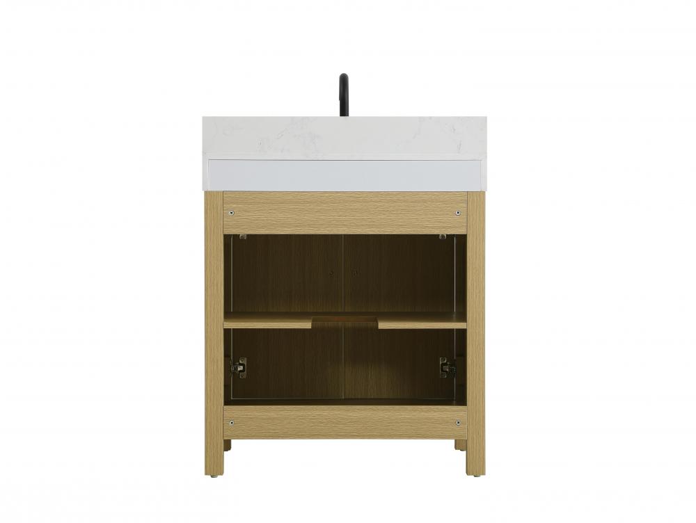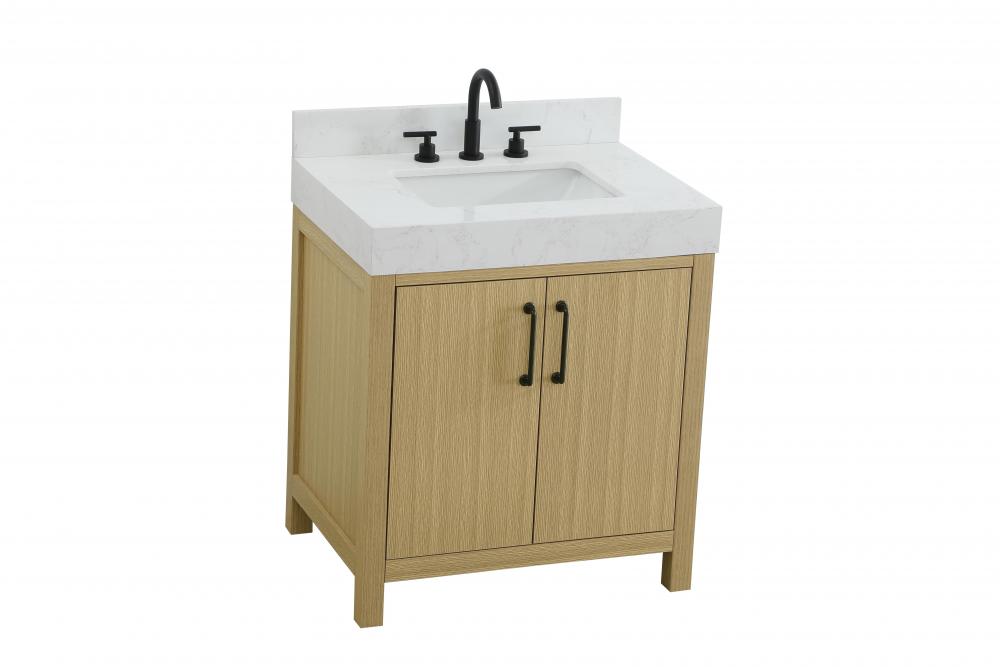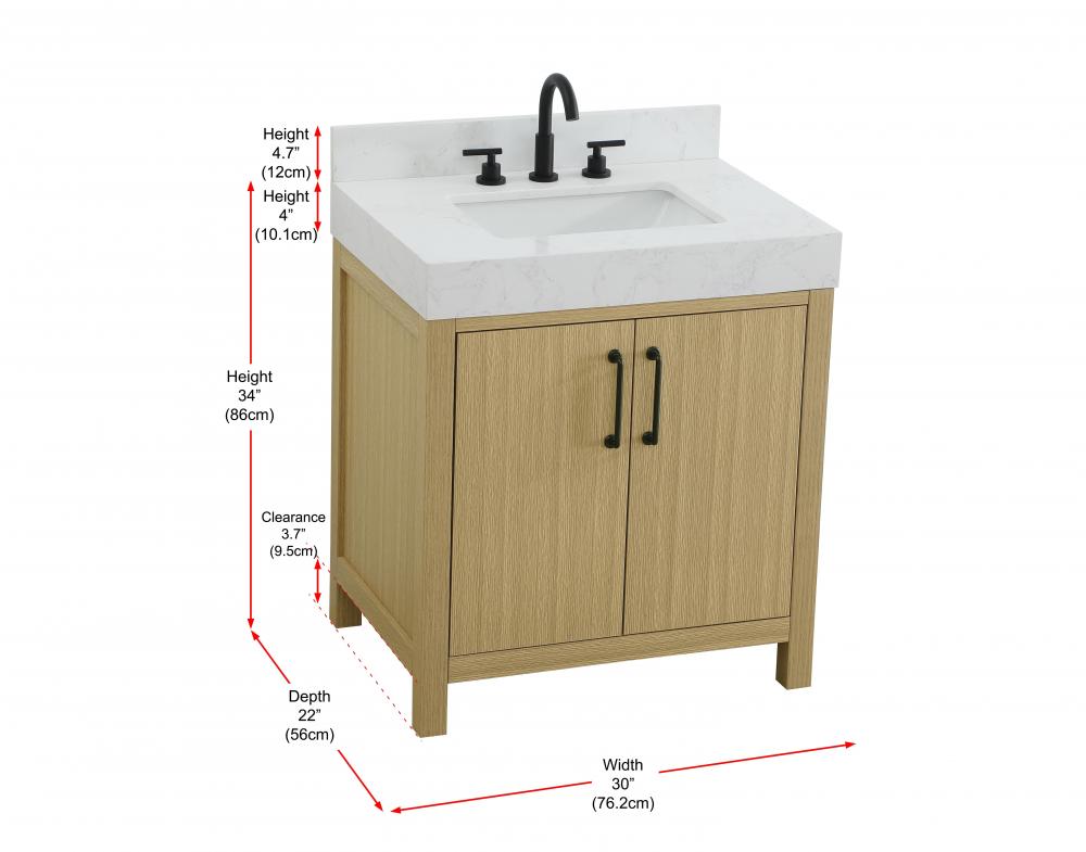 This bathroom vanity showcases a balanced blend of contemporary style and warm, natural-like elements, making it a versatile addition to various interior designs. The clean, straight edges and flat-panel doors lend a modern, streamlined look, while the soft, light wood finish highlights the faux grain pattern, adding warmth and a sense of organic texture to the piece. The vanity features a functional layout, with two cabinet doors, creating a balanced and organized look. Matte black hardware, including slim and cylindrical pulls, contrasts elegantly against the light wood, reinforcing its contemporary vibe while providing subtle visual interest. The thick engineered marble countertop in crisp white adds a sharp contrast to the light base, creating a visually dynamic combination that is both functional and stylish. This vanity is perfect for those seeking a design that combines modern simplicity with a touch of bold refinement. This vanity is delivered fully assembled and equipped with foot levelers for effortless installation and stability. Combining practicality and bold design, this vanity is UPC certified and ready to transform your bathroom space. The matching backsplash seamlessly integrates with the countertop, offering a cohesive design that protects walls from splashes while maintaining a unified look.