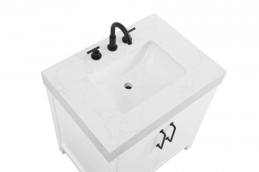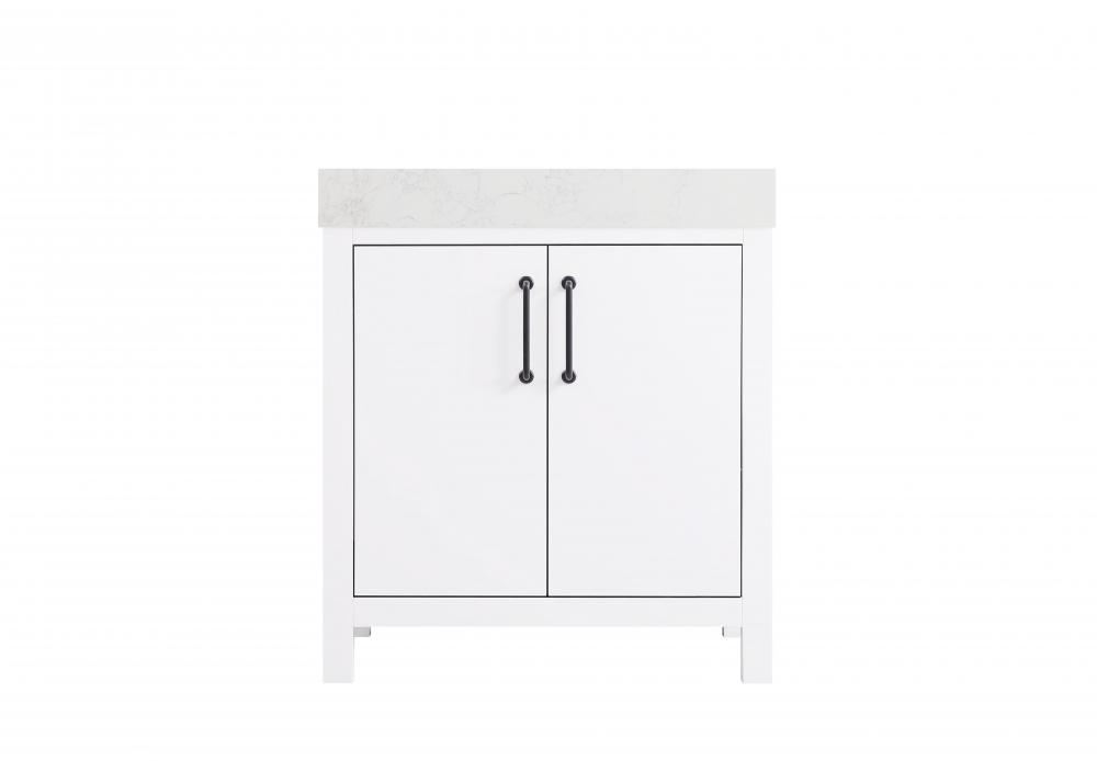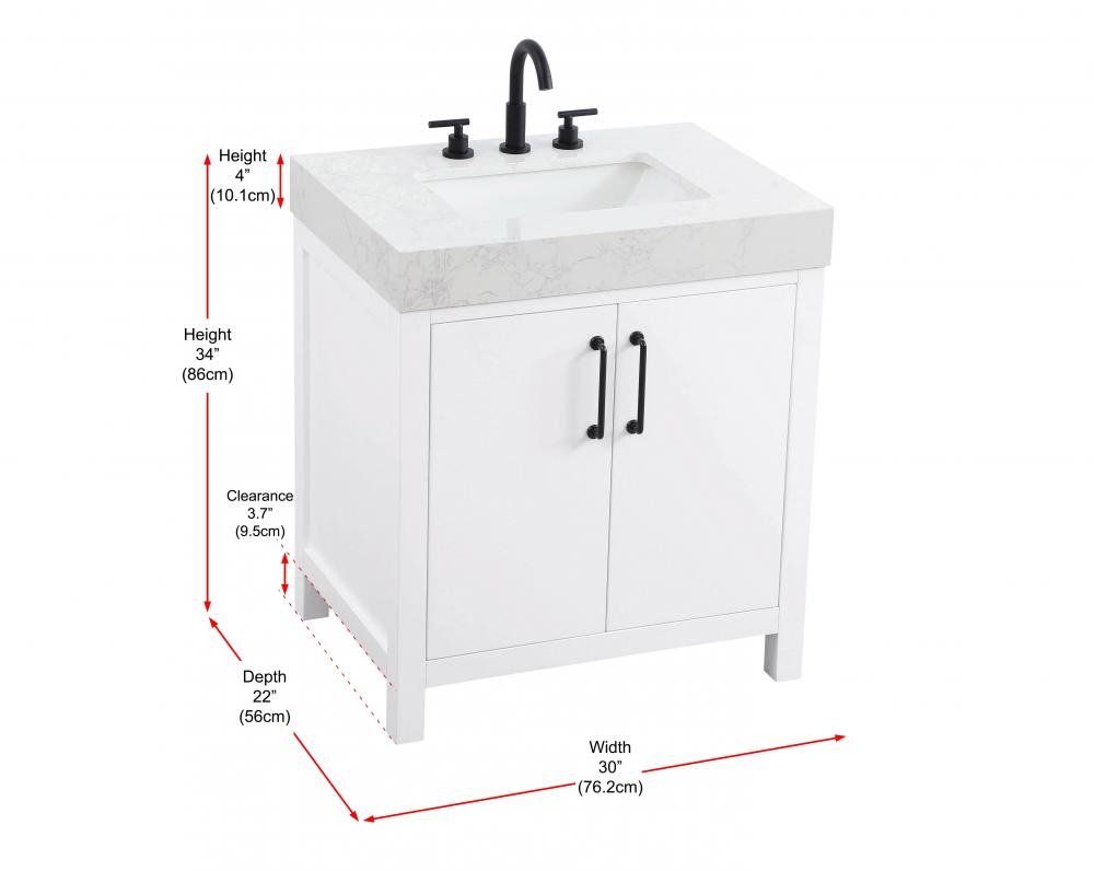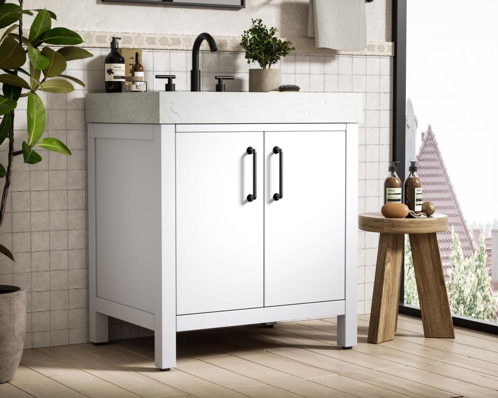 This bathroom vanity presents a crisp and modern design that enhances any bathroom with a clean, bright appearance. The pure white finish amplifies the sense of space and light, making it ideal for creating a fresh and contemporary atmosphere. Its structured design, featuring symmetrical drawers on either side and a centered door, adds balance and organization to the overall aesthetic. The matte black hardware, including linear drawer pulls and a door handle, provides a bold contrast against the white base, emphasizing the modern style. The straight lines of the hardware harmonize with the vanity's simple yet refined structure. Topped with a thick engineered marble countertop in a soft white tone, the vanity achieves a cohesive look that feels polished and functional. Its design is versatile, making it a fitting choice for bathrooms with both modern and transitional decor themes. This vanity is delivered fully assembled and equipped with foot levelers for effortless installation and stability. Complete the setup with an optional matching backsplash, sold separately. Combining practicality and bold design, this vanity is UPC certified and ready to transform your bathroom space.