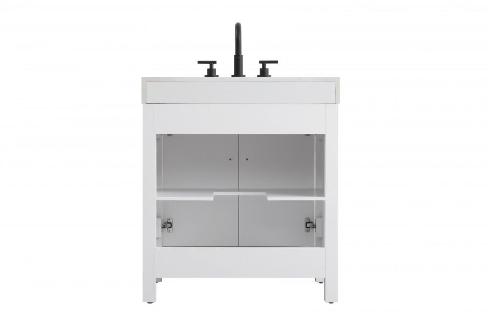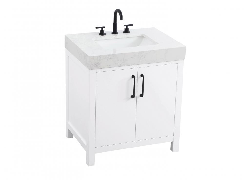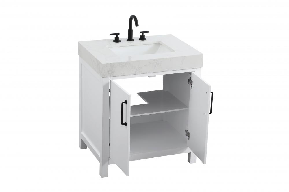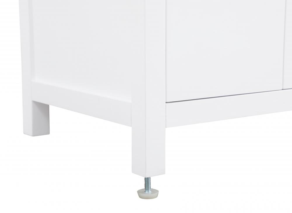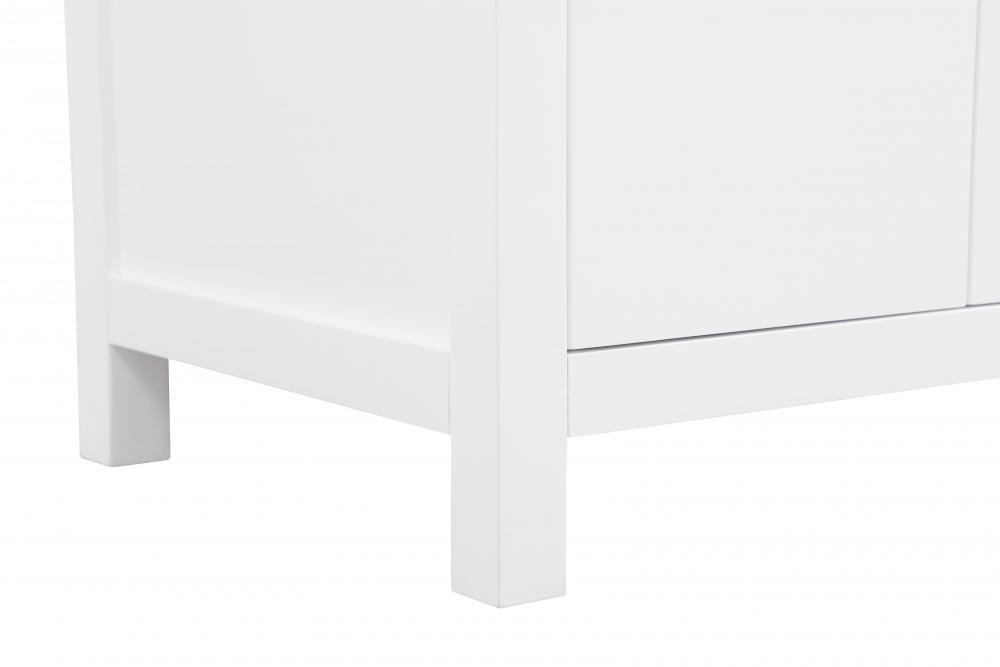 This bathroom vanity presents a crisp and modern design that enhances any bathroom with a clean, bright appearance. The pure white finish amplifies the sense of space and light, making it ideal for creating a fresh and contemporary atmosphere. Its structured design, featuring symmetrical drawers on either side and a centered door, adds balance and organization to the overall aesthetic. The matte black hardware, including linear drawer pulls and a door handle, provides a bold contrast against the white base, emphasizing the modern style. The straight lines of the hardware harmonize with the vanity's simple yet refined structure. Topped with a thick engineered marble countertop in a soft white tone, the vanity achieves a cohesive look that feels polished and functional. Its design is versatile, making it a fitting choice for bathrooms with both modern and transitional decor themes. This vanity is delivered fully assembled and equipped with foot levelers for effortless installation and stability. Complete the setup with an optional matching backsplash, sold separately. Combining practicality and bold design, this vanity is UPC certified and ready to transform your bathroom space.