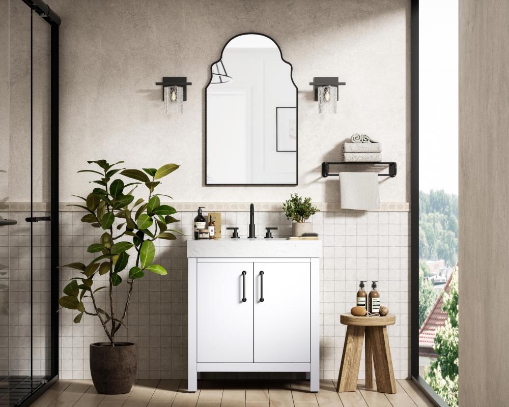 The door pulls are sleek, cylindrical handles in a matte black finish, providing a striking contrast to the white finish of the vanity.