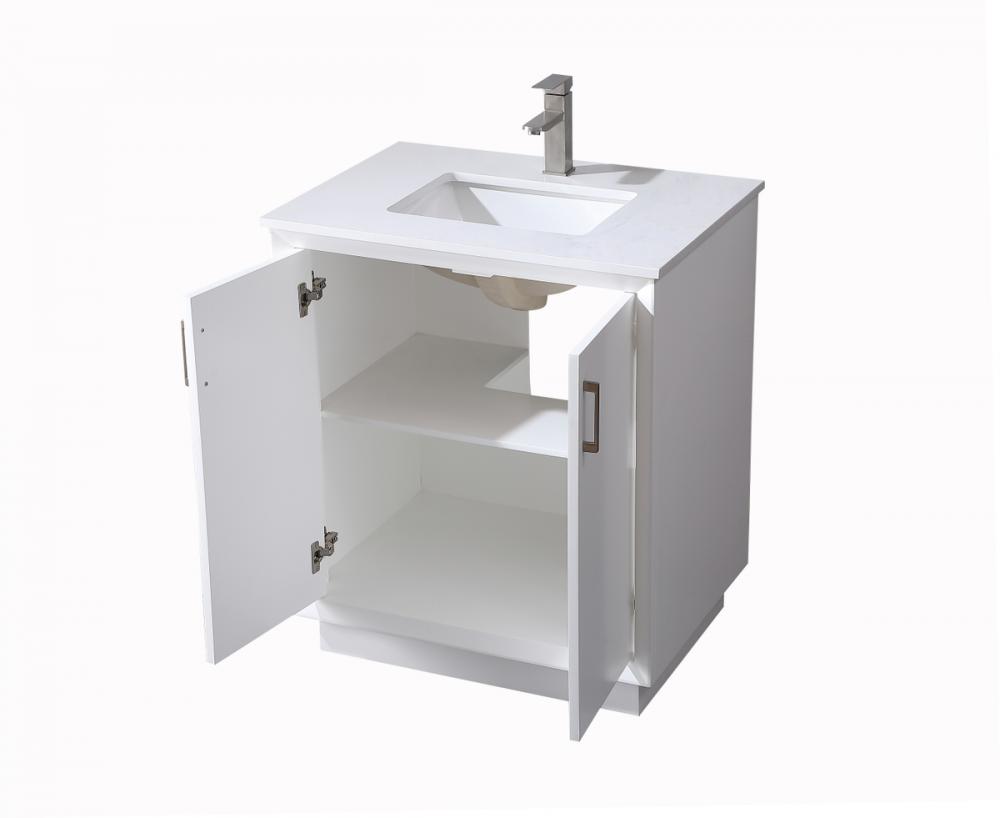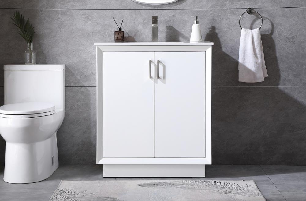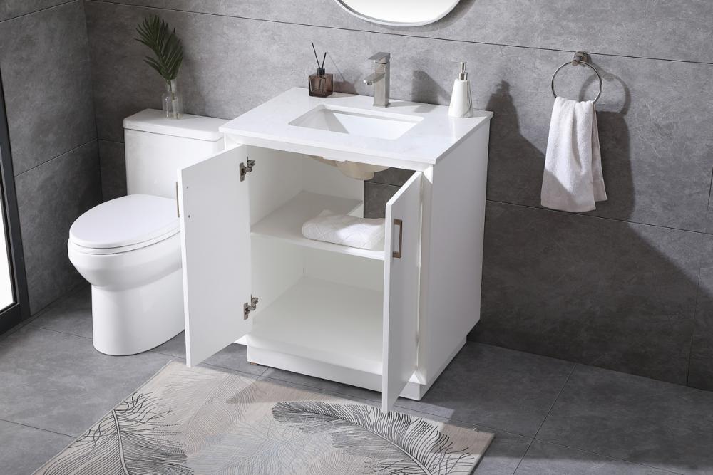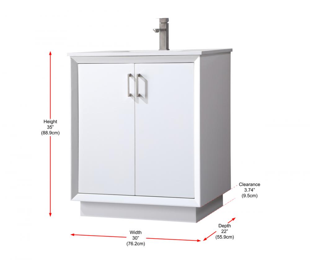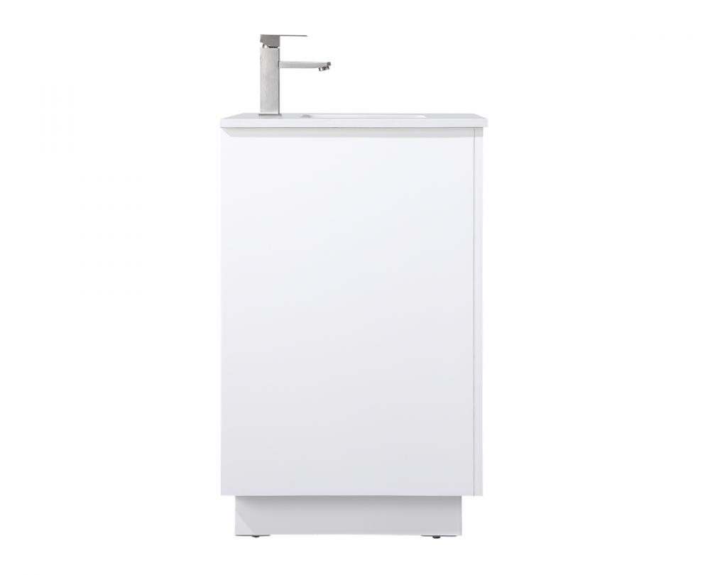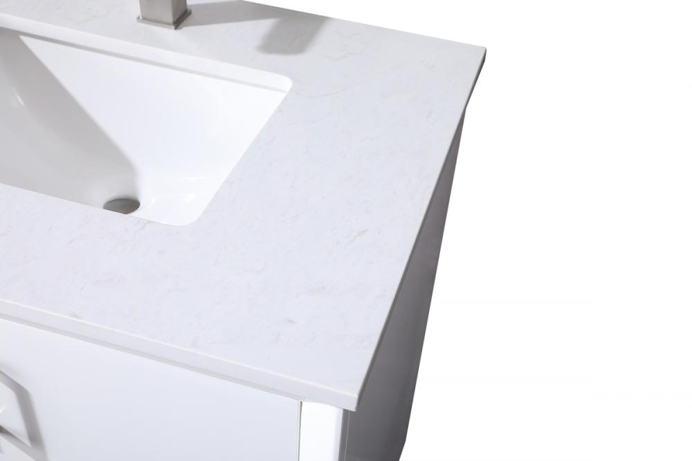Step into a realm of modern luxury with our freestanding bathroom vanity, featuring a sleek and contemporary boxy design that sets new standards for aesthetics. The engineered marble countertop, with its crisp 0.75-inch straight edge, not only introduces sophistication but also ensures enduring durability. Convenience takes center stage with the undermount porcelain sink, measuring 15.35 inches long, 11 inches wide, and 7 inches deep, complemented by a single predrilled faucet hole for seamless installation. Experience the art of organization through soft-closing doors adorned with high-quality bar pulls. The vanity, crafted from resilient MDF material, combines elegance with durability, supported by solid wood legs that provide stability and a touch of natural warmth. Elevate your bathroom with this distinctive piece, where the fusion of form and function creates a harmonious dance of modern sophistication, redefining your daily routine with a statement in style and practicality.