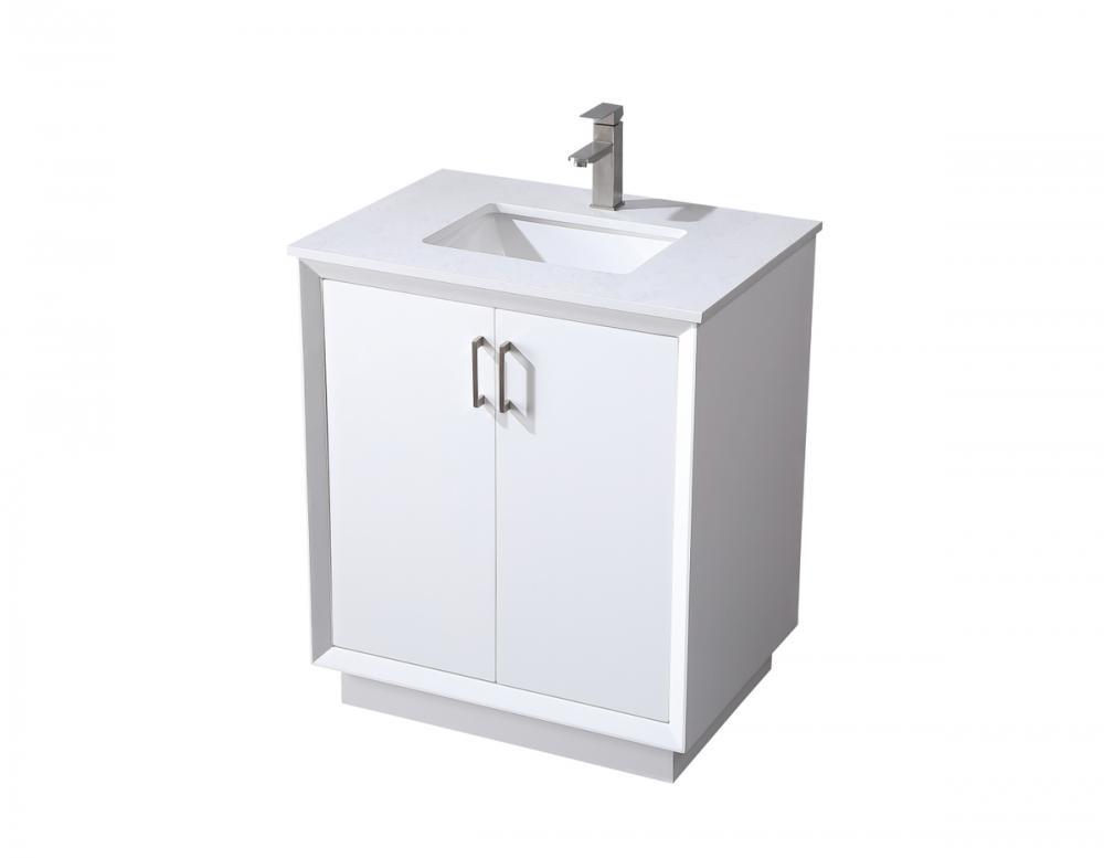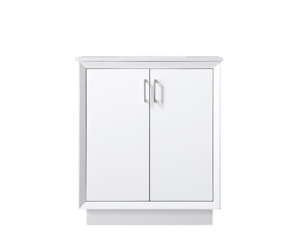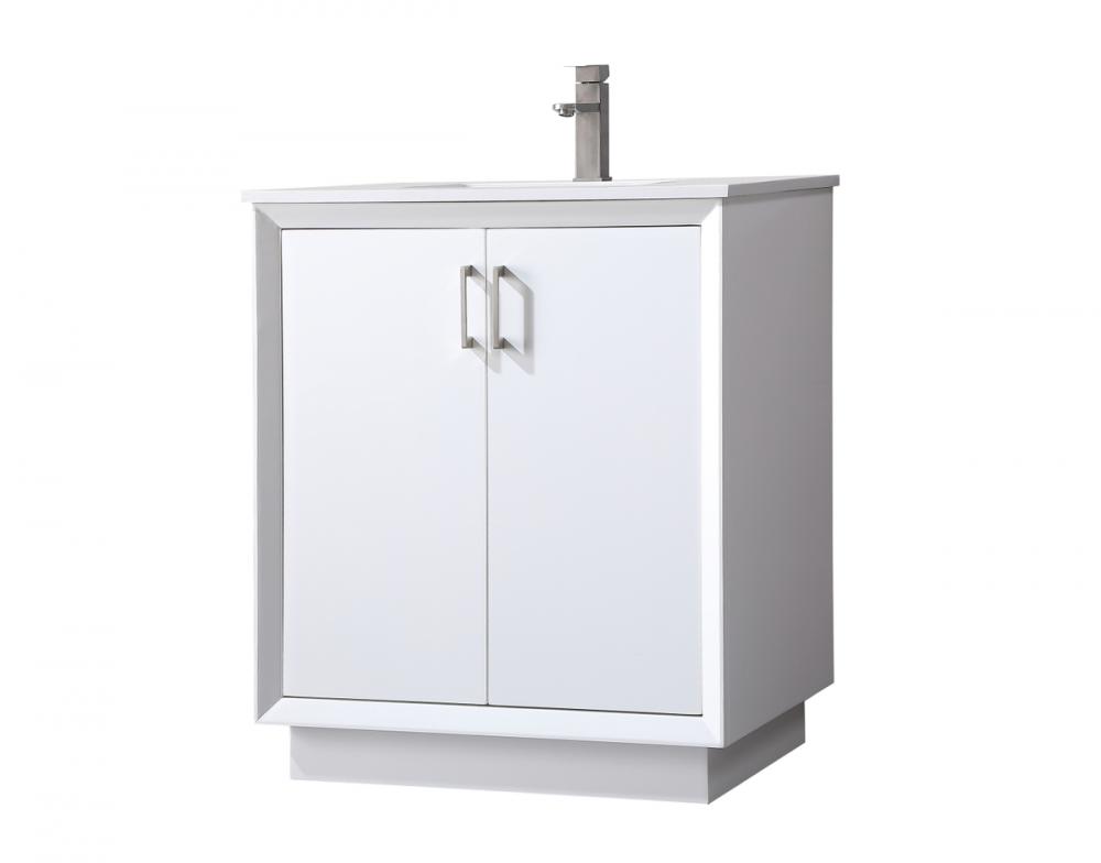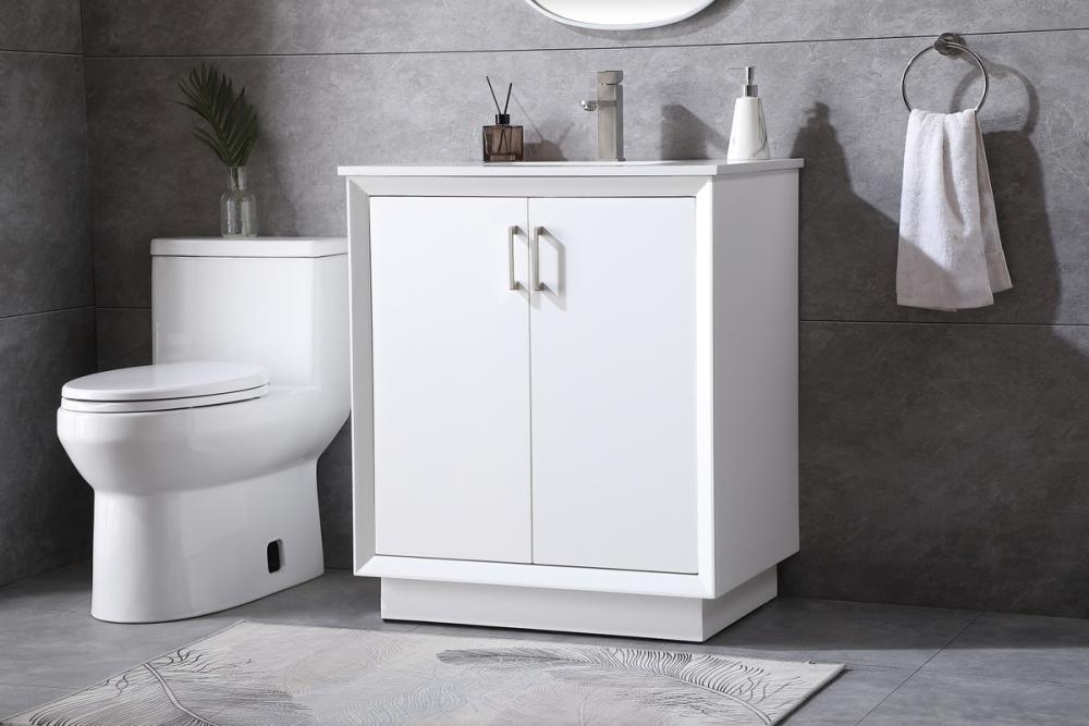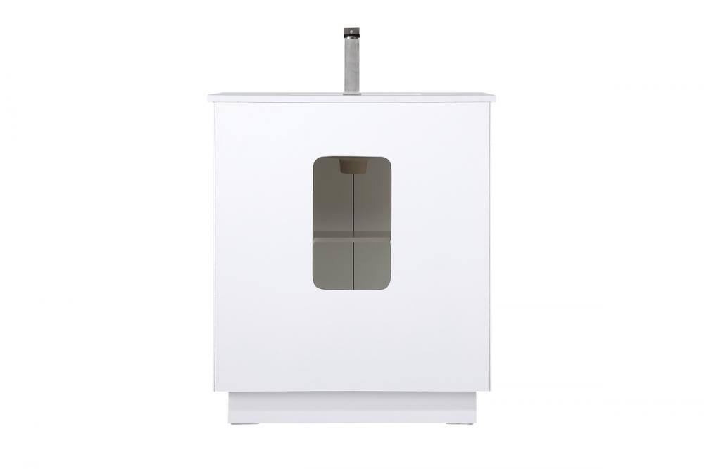 Step into a realm of modern luxury with our freestanding bathroom vanity, featuring a sleek and contemporary boxy design that sets new standards for aesthetics. The engineered marble countertop, with its crisp 0.75-inch straight edge, not only introduces sophistication but also ensures enduring durability. Convenience takes center stage with the undermount porcelain sink, measuring 15.35 inches long, 11 inches wide, and 7 inches deep, complemented by a single predrilled faucet hole for seamless installation. Experience the art of organization through soft-closing doors adorned with high-quality bar pulls. The vanity, crafted from resilient MDF material, combines elegance with durability, supported by solid wood legs that provide stability and a touch of natural warmth. Elevate your bathroom with this distinctive piece, where the fusion of form and function creates a harmonious dance of modern sophistication, redefining your daily routine with a statement in style and practicality.