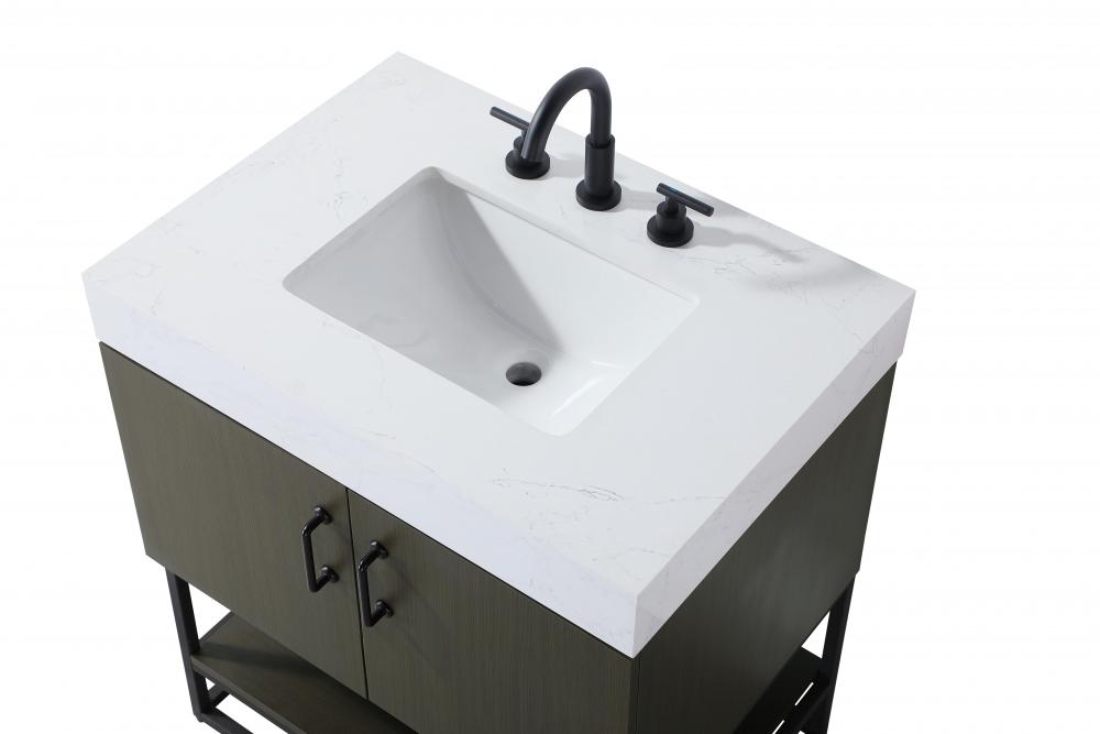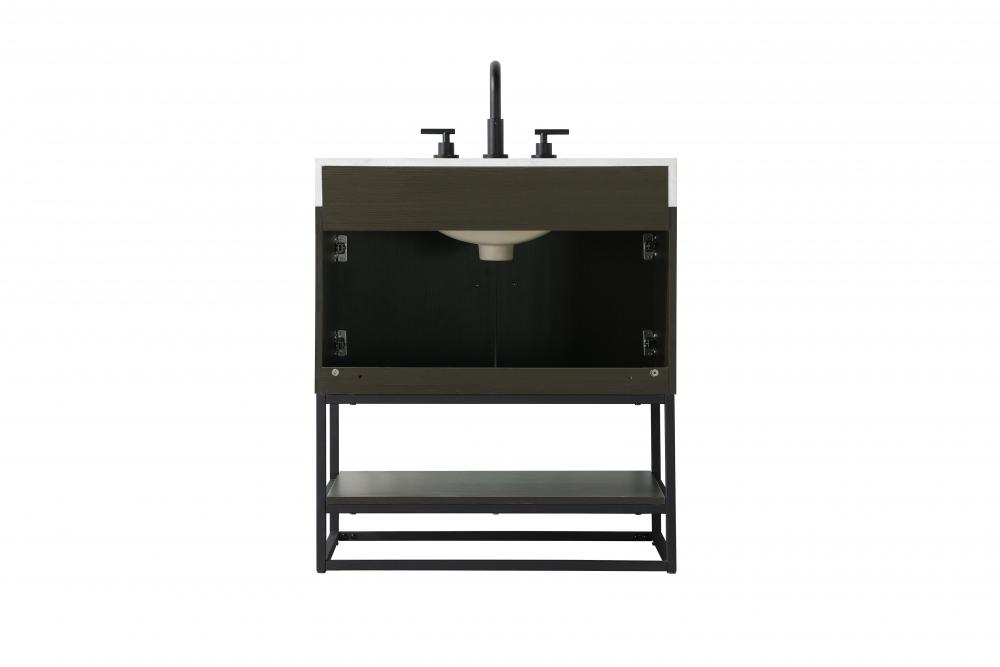 Upgrade your bathroom with this stylish transitional vanity, available in five stunning finishes, from crisp white to warm honey brown, designed to suit a variety of decor styles. The minimalist flat door panels and open wood shelf create a functional yet visually appealing storage solution, while the slender black metal legs elevate the look with modern sophistication. The 4-inch thick white engineered marble countertop, accented with natural veining, adds a luxurious touch, perfectly complemented by soft-closing doors with sleek black metal bar pulls. Thoughtful details like the concealed overflow, back panel cutout for plumbing, and 3 pre-drilled holes for an 8-inch faucet make installation easy and efficient. with a porcelain sink and farmhouse-inspired touches, this vanity brings both elegance and practicality to any bathroom setting.