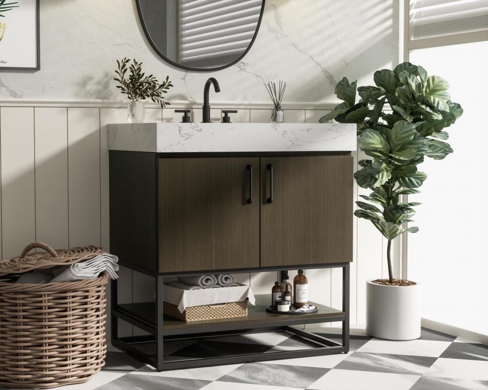 This transitional bathroom vanity is available in five curated finishes to suit any style: Crisp White for timeless elegance, Sleek Grey for a modern touch, Mocha Brown for a rich, luxurious feel.