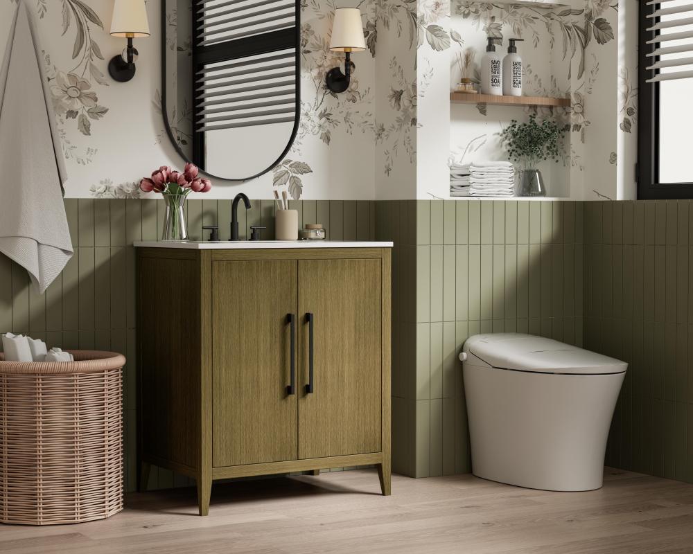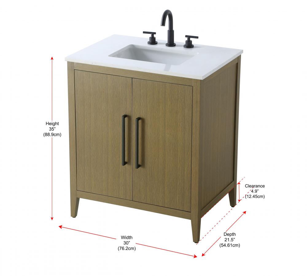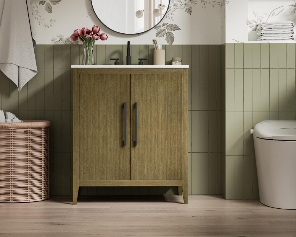 Bring both elegance and practicality to your bathroom with this transitional vanity, available in a selection of rich finishes that highlight the beauty of faux wood grain in shades of mocha, chestnut, and honey, along with classic white and modern grey. The flat door panels and sleek black metal pulls create a minimalist yet refined aesthetic, while the soft-closing drawers and tapered legs with levelers provide smooth, functional operation. Topped with a luxurious white engineered marble countertop and featuring a porcelain sink, this vanity combines timeless style with modern efficiency. Thoughtfully designed with U-shaped cutout for plumbing, it offers ample storage and easy installation, making it the perfect centerpiece for any bathroom.