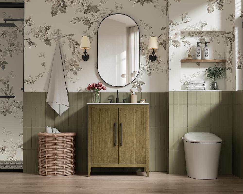 The minimalist flat door panels create a sleek, modern appearance, perfect for blending into transitional and contemporary bathroom designs.