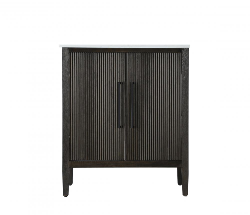 The slender black metal pulls on the doors provide sleek, modern accents, enhancing the vanity's elegant design.