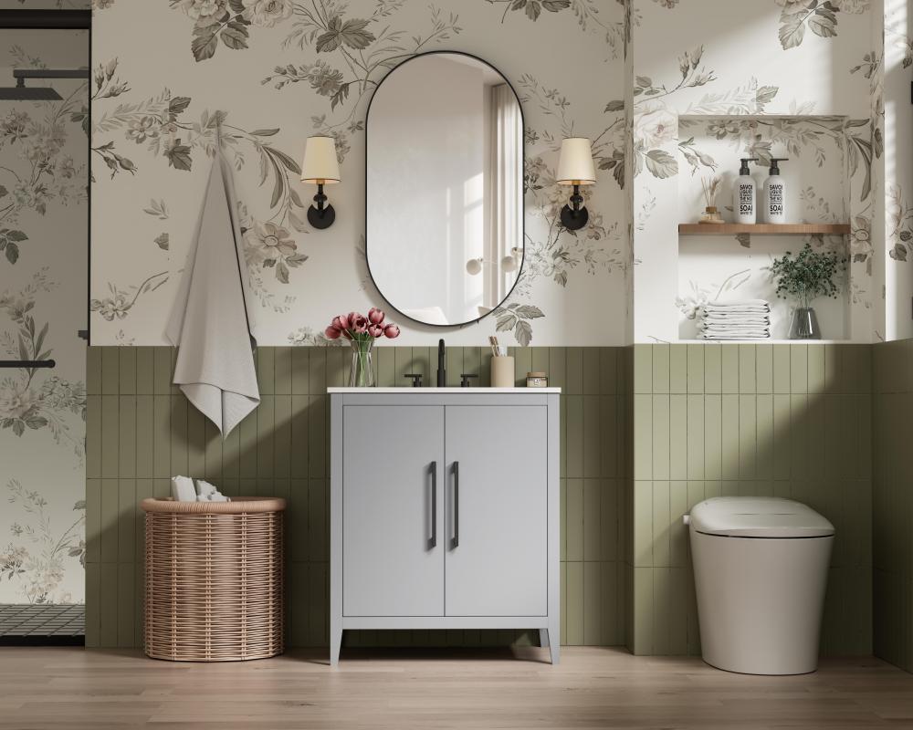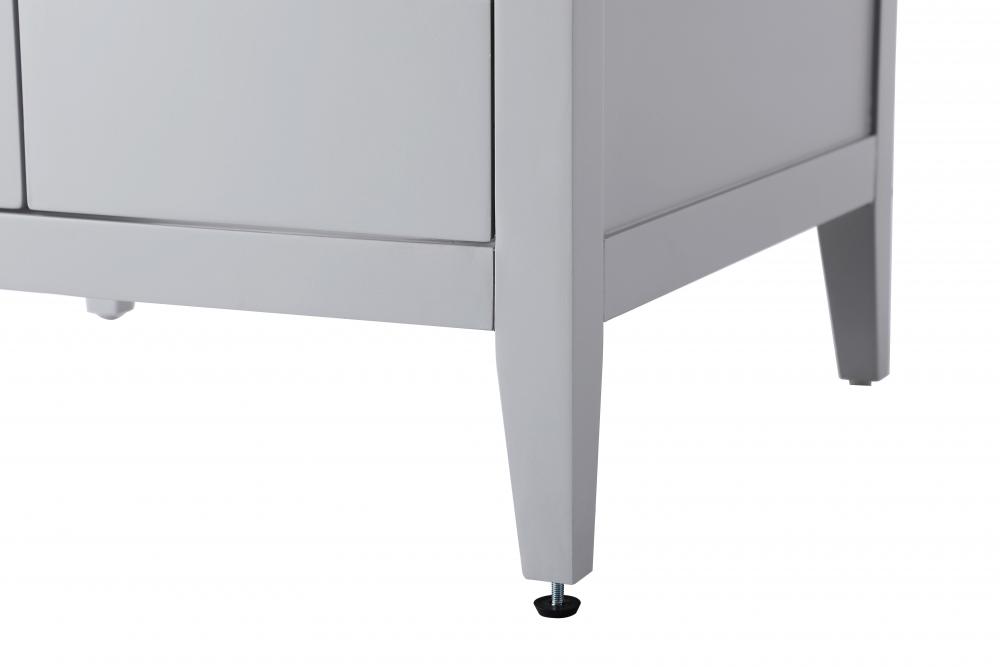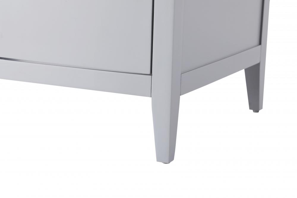 The vanity stands on tapered 5-inch solid wood legs with levelers for a balanced, polished look, combining modern style with practicality.