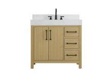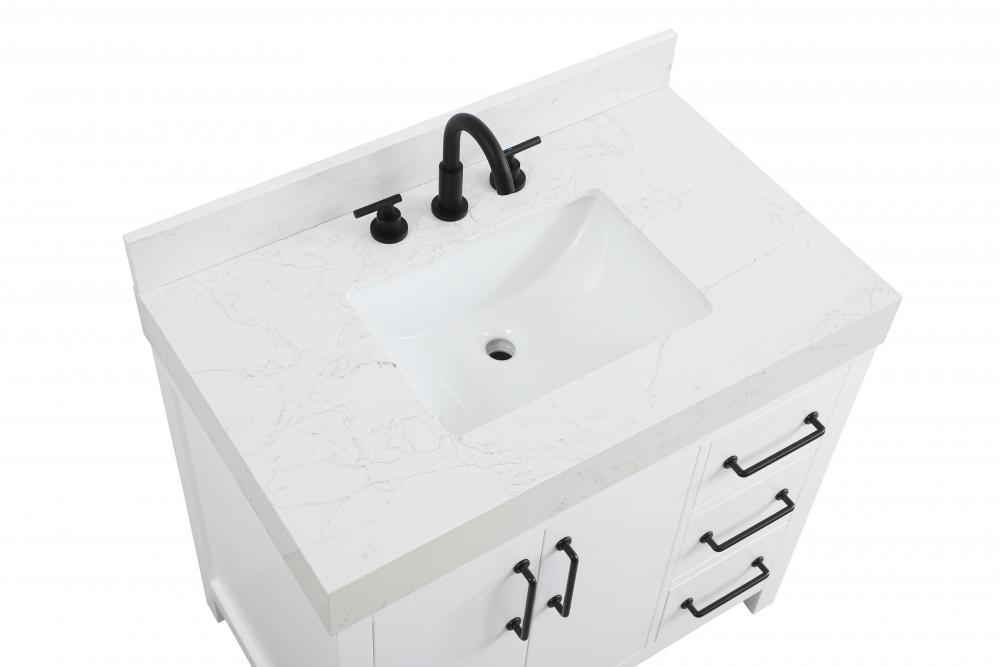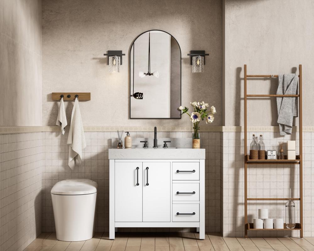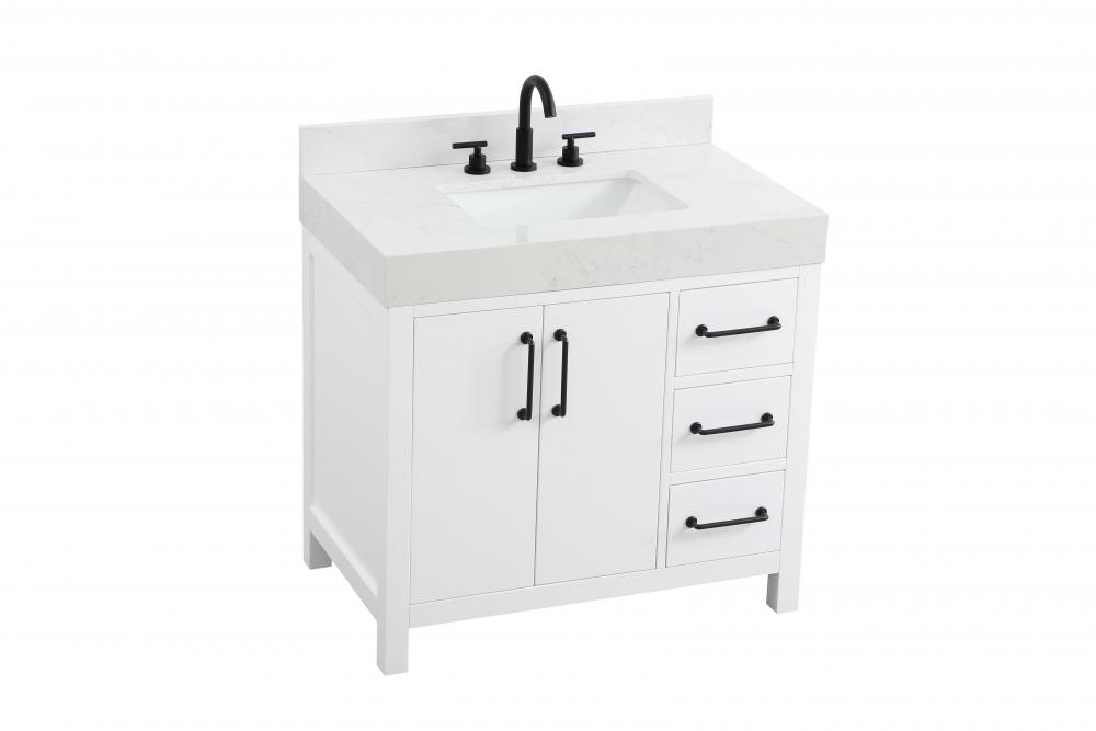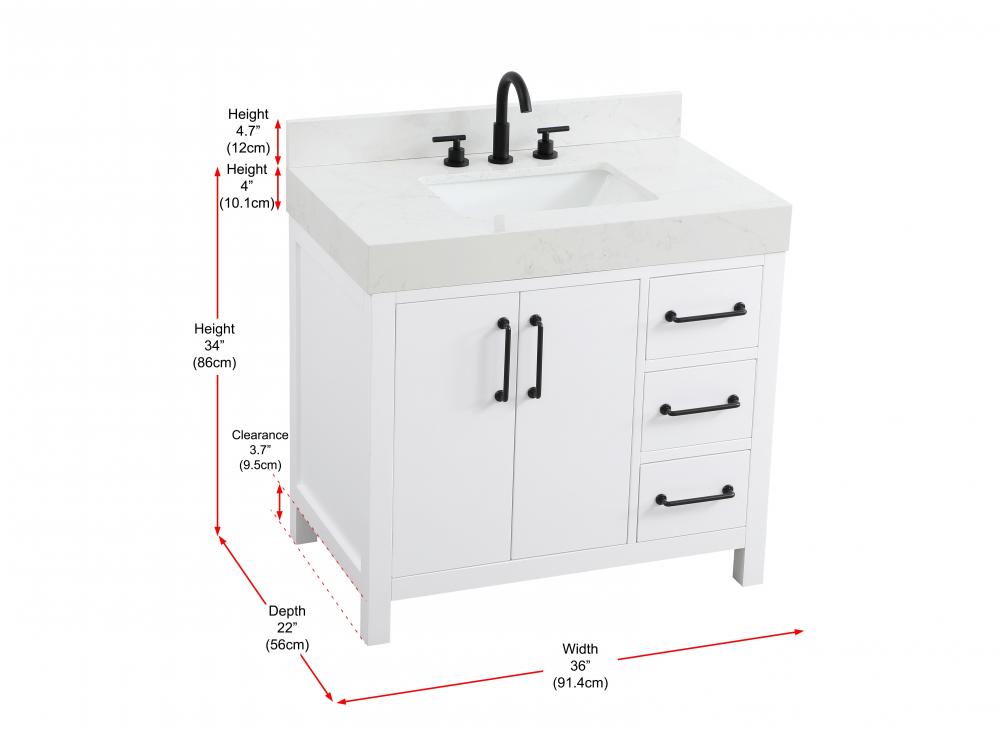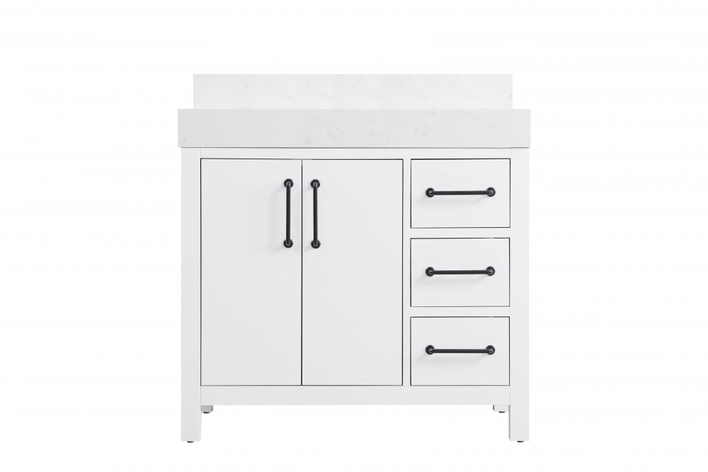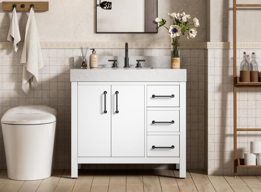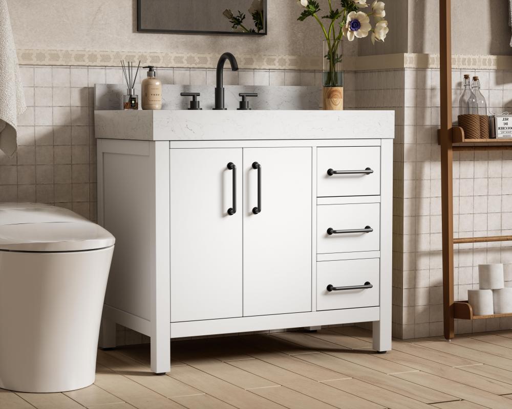 This bathroom vanity exudes a clean and structured design, making it a versatile addition to modern and transitional bathrooms. The bright white finish enhances the room's sense of light and space, creating a crisp and refreshing appearance. Elevate your bathroom functionality with this thoughtfully designed bathroom vanity cabinet. The standout feature is the engineered marble countertop, boasting a bold 4-inch thickness and natural veining for a striking visual appeal. The vanity features a functional layout, with two cabinet doors on one side and three stacked drawers on the other, creating a balanced and organized look. Matte black hardware, including slim and cylindrical pulls, contrasts elegantly against the white wood, reinforcing its contemporary vibe while providing subtle visual interest. The thick engineered marble countertop in crisp white adds a sharp contrast to the dark base, creating a visually dynamic combination that is both functional and stylish. This vanity is perfect for those seeking a design that combines modern simplicity with a touch of bold refinement. This vanity is delivered fully assembled and equipped with foot levelers for effortless installation and stability. Combining practicality and bold design, this vanity is UPC certified and ready to transform your bathroom space. The matching backsplash seamlessly integrates with the countertop, offering a cohesive design that protects walls from splashes while maintaining a unified look.