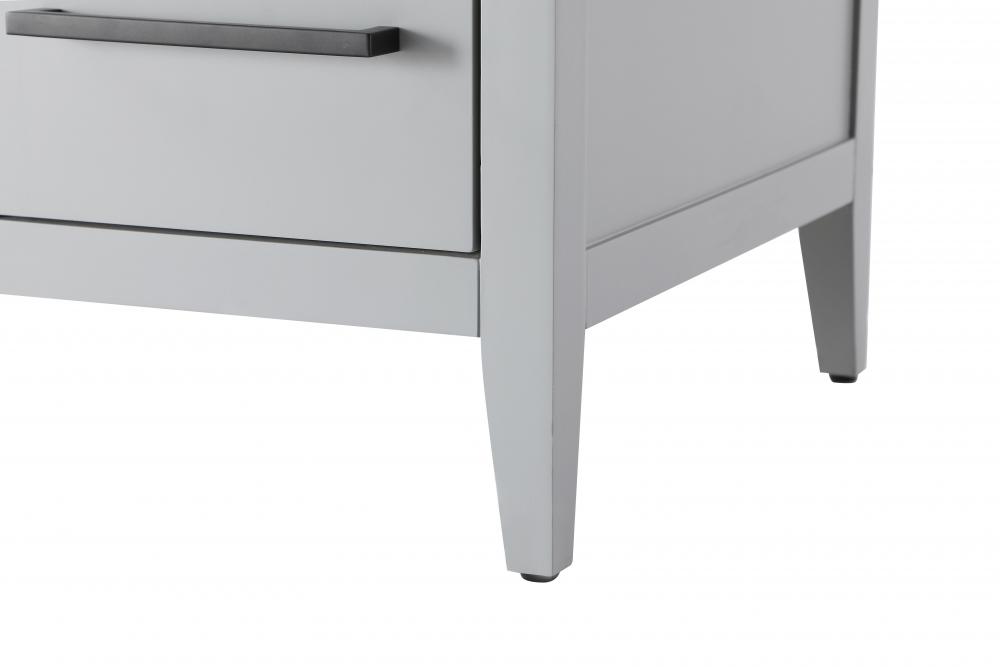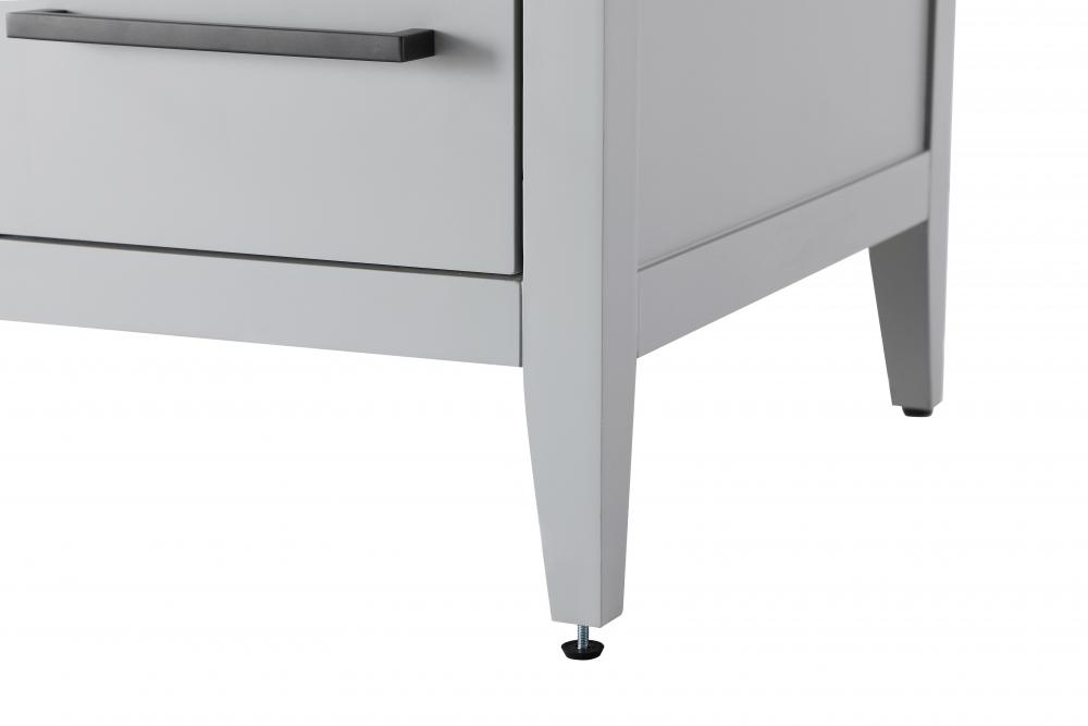 The vanity stands on tapered 5-inch solid wood legs with levelers for a balanced, polished look, combining modern style with practicality.