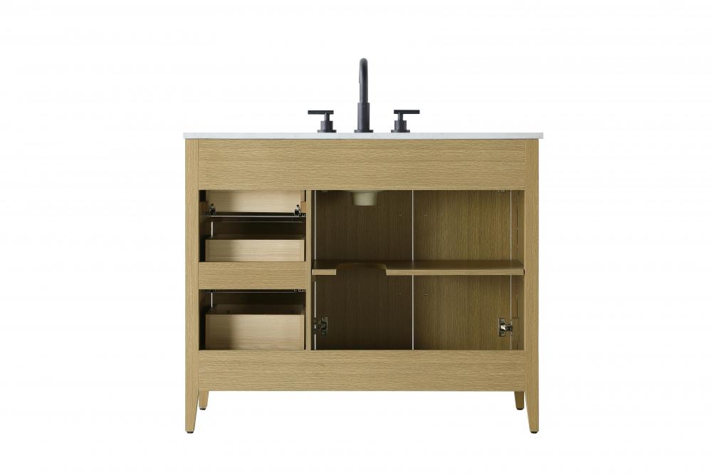 Inside the cabinet, a U-shaped cutout shelf ensures that the plumbing is neatly accommodated without sacrificing valuable storage space.