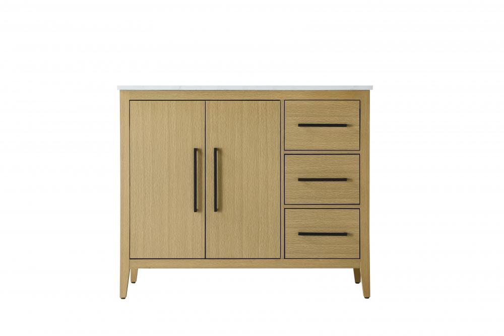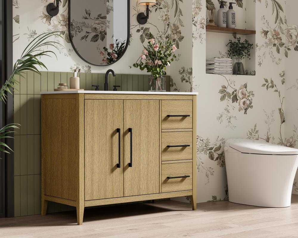 Bring both elegance and practicality to your bathroom with this transitional vanity, available in a selection of rich finishes that highlight the beauty of faux wood grain in shades of mocha, chestnut, and honey, along with classic white and modern grey. The flat door panels and sleek black metal pulls create a minimalist yet refined aesthetic, while the soft-closing drawers and tapered legs with levelers provide smooth, functional operation. Topped with a luxurious white engineered marble countertop and featuring a porcelain sink, this vanity combines timeless style with modern efficiency. Thoughtfully designed with U-shaped cutout for plumbing, it offers ample storage and easy installation, making it the perfect centerpiece for any bathroom.