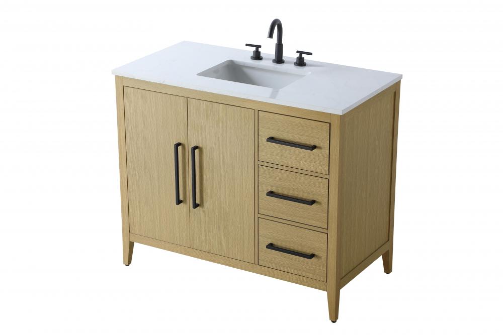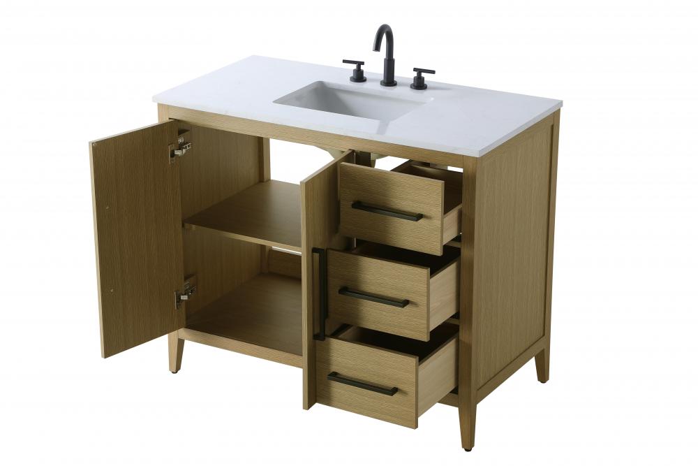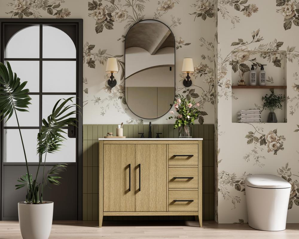 The vanity stands on tapered 5-inch solid wood legs with levelers for a balanced, polished look, combining modern style with practicality.