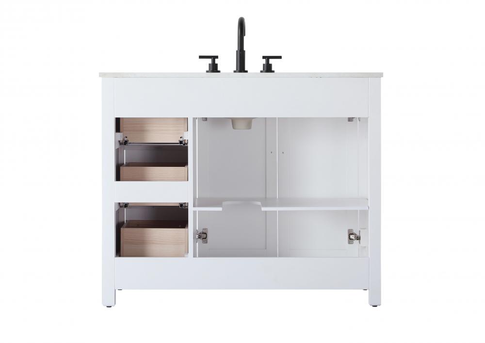 The countertop, made from white engineered marble, features subtle veining for a luxurious yet durable surface that’s easy to clean and maintain.
