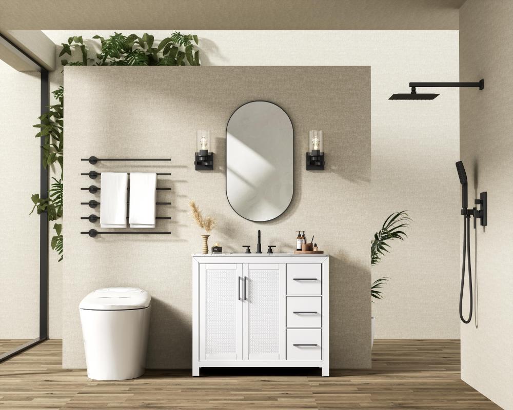 Perfect for those with an eye for detail and quality, this transitional vanity blends modern design with timeless elegance. Available in five stunning finishes, from Crisp White to Linen Oak, the wood grain visuals of the oak options bring warmth and character to any bathroom. The caning design on the Shaker-style door panels adds texture and a touch of refinement, while the soft-closing doors and drawers ensure smooth, quiet functionality. Topped with a white engineered marble countertop, the vanity offers both luxury and practicality, complete with pre-drilled faucet holes for customization. A concealed overflow and U-shaped shelf for plumbing make installation effortless, and the slender black metal pulls provide a sleek contrast.