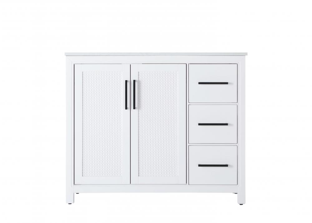The slender black metal handle pulls on the doors and drawers offer a sleek, modern contrast to the white finish, adding to the vanity's sophisticated look.
