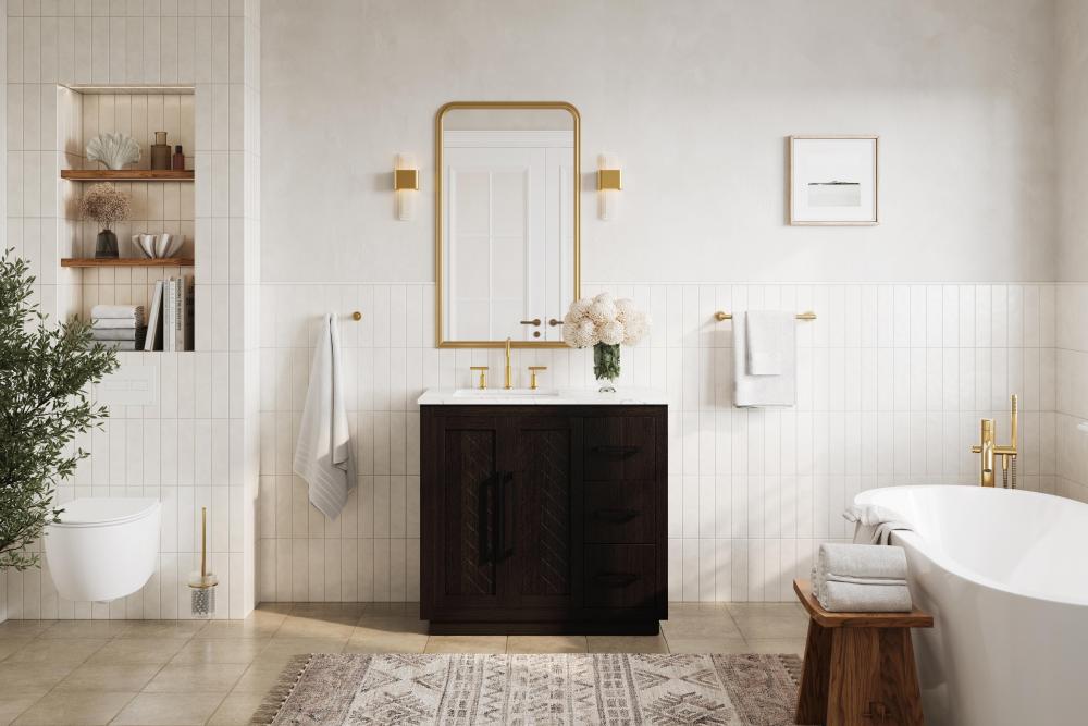 The vanity includes a concealed overflow, keeping the design sleek and uninterrupted, while ensuring practical overflow protection.