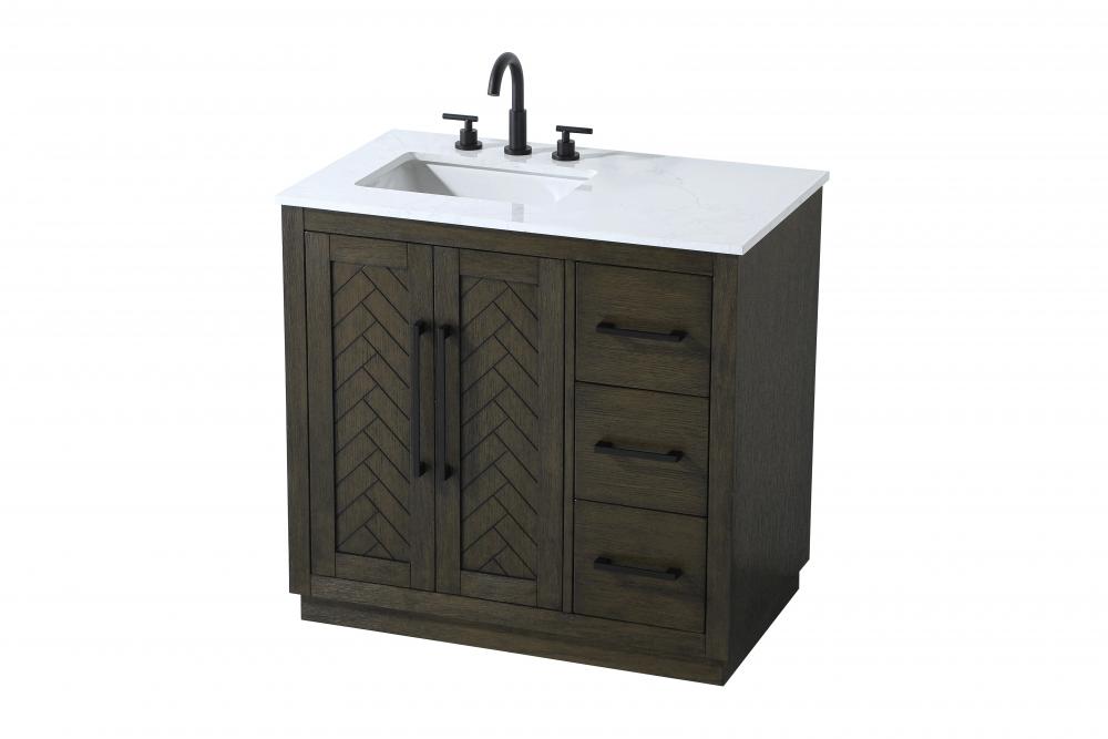 This transitional bathroom vanity offers the perfect blend of timeless style and modern functionality. Available in five refined finishes—crisp white, sleek grey, chocolate oak, honey oak, and linen oak—it complements a range of decor styles, from classic to contemporary. The stunning herringbone design on the Shaker-style door panels adds texture and craftsmanship to the piece. Topped with a white engineered marble countertop featuring subtle veining, it provides both beauty and durability. The long black metal pulls on the soft-closing doors and the thin bar pulls on the drawers add sleek, modern detailing. Practical features include a concealed overflow, a back panel cutout for easy plumbing installation, and a U-shaped cutout shelf to fit plumbing while maximizing storage space. with a toe kick all around the base, this vanity is thoughtfully designed to blend form and function in any bathroom setting.